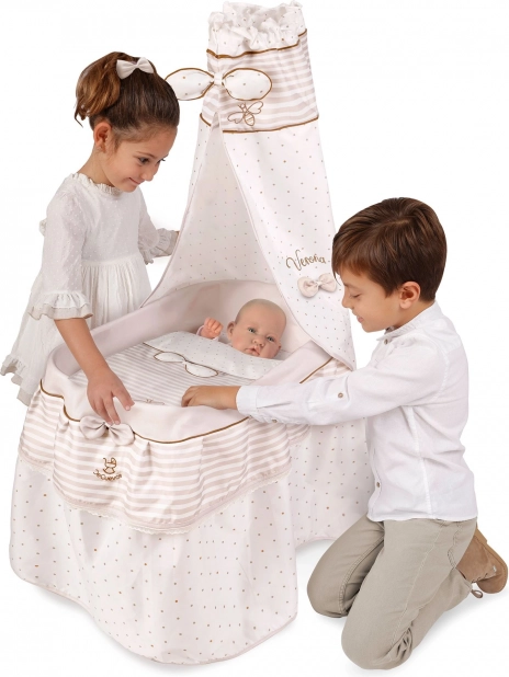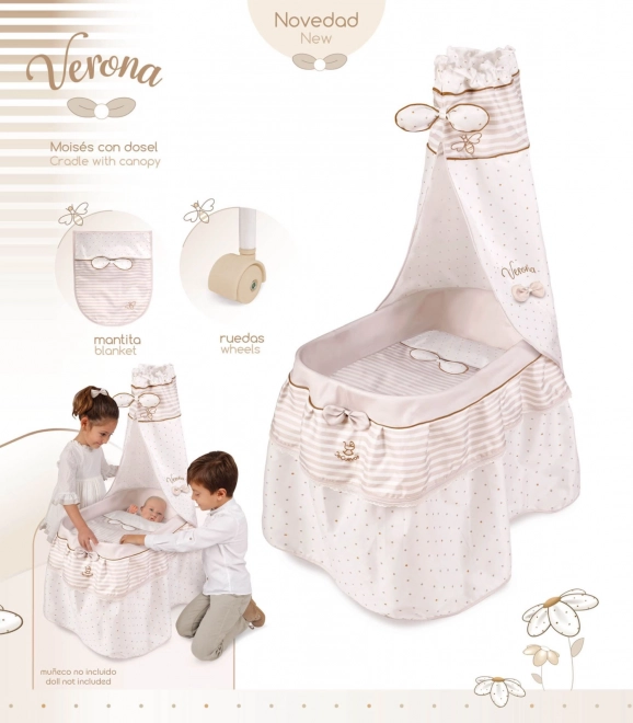 Elegantiška važinamoji lėlių lovytė iš VERONA kolekcijos pasižymi švelniu natūraliu dizainu, baldakimu su kaspinėliais, patogia antklode ir 4 pasukamais ratukais, kad būtų lengva manevruoti. Preciziškas apdirbimas, lengvas valdymas ir saugios medžiagos pradžiugins kiekvieną mažą mamytę.