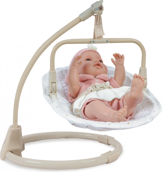 Dėl nuimamos ir dvipusės sėdynės gaminį galima naudoti kaip valgomojo kėdutę su padėkliuku, raminančias supynes arba atskirą nešioklę. Tvirta metalinė konstrukcija dera su lengvais plastikiniais elementais ir maloniu tekstiliniu užvalkalu – patogu lėlei ir lengva prižiūrėti.