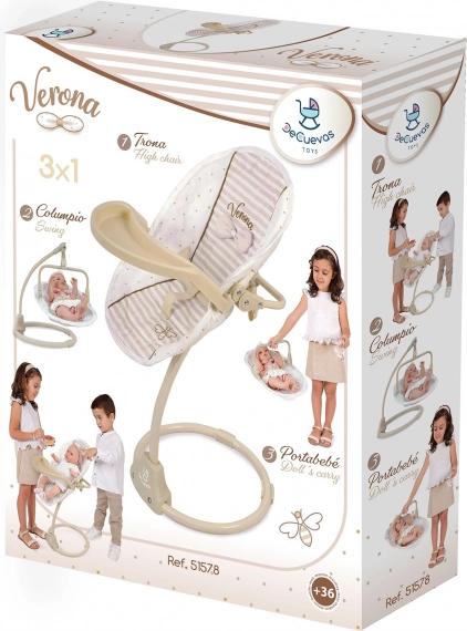 Ši multifunkcinė 3 viename lėlių kėdutė ir supynės iš Verona kolekcijos suteikia vaikams realistišką žaidimą ir daugybę galimybių rūpintis mėgstamu kūdikiu. Šviesiai smėlinės ir baltos spalvų derinys su taškelių ar juostelių raštais, papildytas subtiliais apsiuvais ir kaspinėlių aplikacijomis, kuria laikui nepavaldų natūralų įvaizdį, įkvėptą ispanų dizaino.
