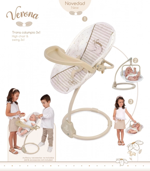 Elegantiškas ir praktiškas 3-ių viename rinkinys iš kolekcijos Verona sujungia valgomojo kėdutę, supynes ir nešioklę viename. Dėl nuimamos, dvipusės sėdynės su saugos diržais ir plastikinio padėkliuko žaisti lengva ir saugu. Šiuolaikiškas dizainas švelnių natūralių spalvų, kokybiškas apdirbimas ir paprastas valdymas pradžiugins kiekvieną vaiką nuo 3 metų.
