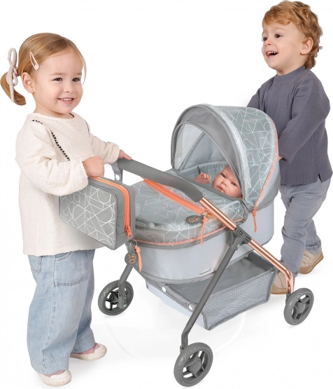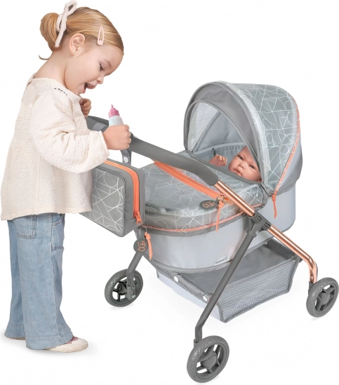 Nuimamas užsegamas krepšys, gulimos dalies uždangalas su permatoma kišene, minkštas čiužinys ir apatinė daiktų vieta – viskas patogiam lėlių vežiojimui.