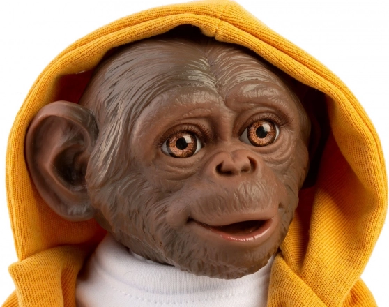 Beždžionėlė aprengta stilingu geltonu megztiniu ir turi itin realistinius veido bruožus, kurie suteikia tikros beždžionės įspūdį.
