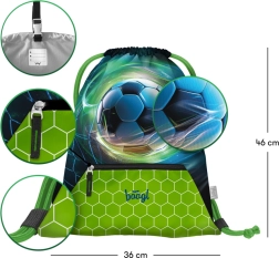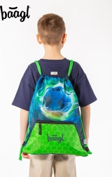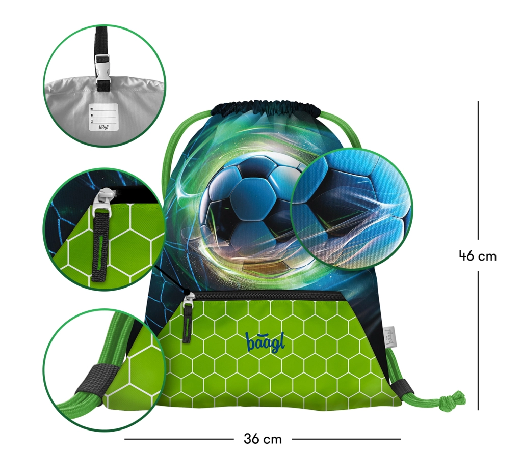 Praktiškas sportinis Baagl maišelis avalynei ir laisvalaikio veikloms su futbolo kamuolio motyvu. Siūlo tvirtą, lengvai valomą medžiagą, užveržimą virvelėmis nešiojimui ant nugaros, karabiną prisegti prie kuprinės ar aktovės ir apatinę kišenę su užtrauktuku smulkmenoms.