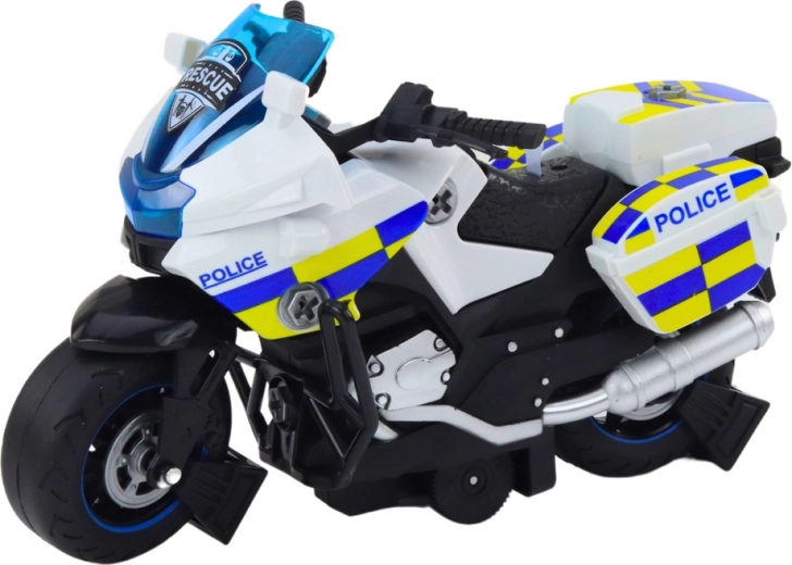 Šis baltas policinis motociklas su mėlynos–geltonos spalvų languotais elementais išsiskiria autentiška išvaizda ir funkcijomis, kurios įtraukia vaikus į veiksmo kupiną žaidimą. Blyksinčios šviesos ir sirenos suteikia policiniam žaidimui tikroviškumo, o smagračio pavara užtikrina sklandų startą vos pastūmus.