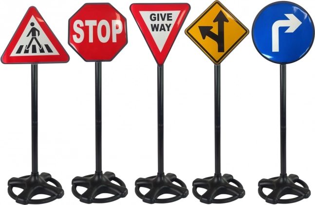Didelė mokomoji priemonė eismo saugumo ugdymui: rinkinys iš 5 kelio ženklų, kurių aukštis 82 cm, su lipdukais klijavimui. Idealu vaikams nuo 3 metų, darželiams ir mokykloms, taip pat pirmai dviračio vairavimo praktikai.