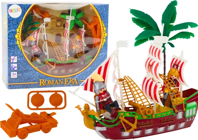 Dėl įmontuotų ratukų laivas lengvai rieda per grindis ar stalą, o katapulta, palmės ir romėnų kareivių figūrėlės leidžia kurti dinamiškus mūšius ir istorines scenas.