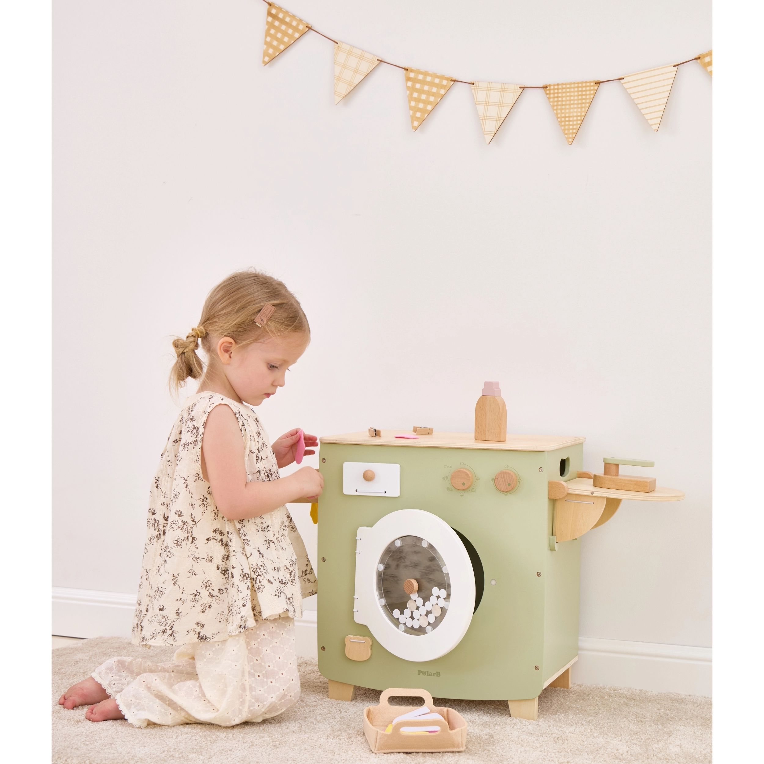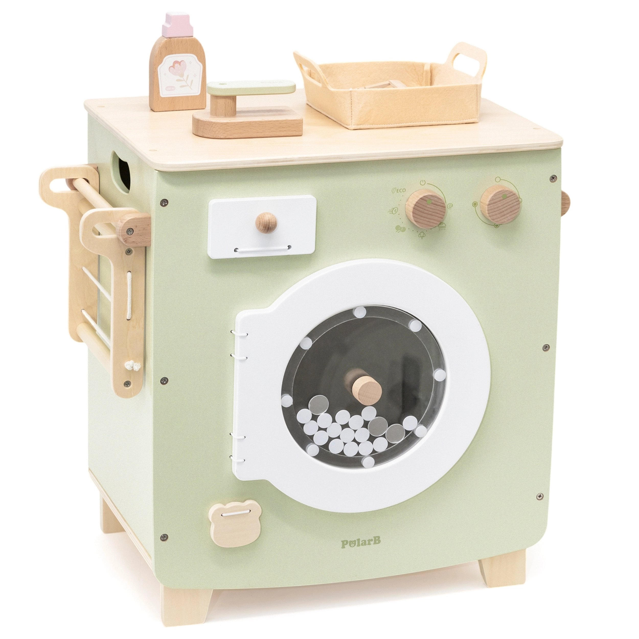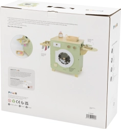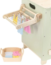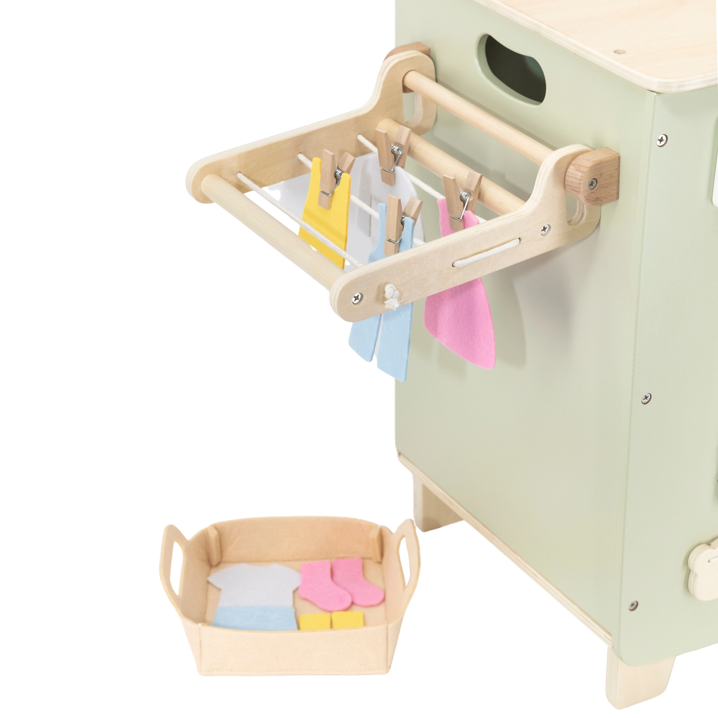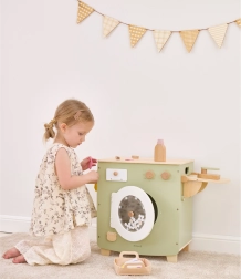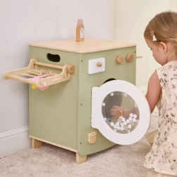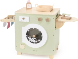 Ši kokybiška medinė skalbimo mašina švelnios pastelės žalios spalvos su natūraliais akcentais suteikia vaikams autentišką skalbimo, džiovinimo ir lyginimo patirtį. Valdymo ratukai, permatomos durelės ir šoninis sulankstomas džiovintuvas su segtukais užtikrina ilgas prasmingo žaidimo valandas ir gebėjimų lavinimą.