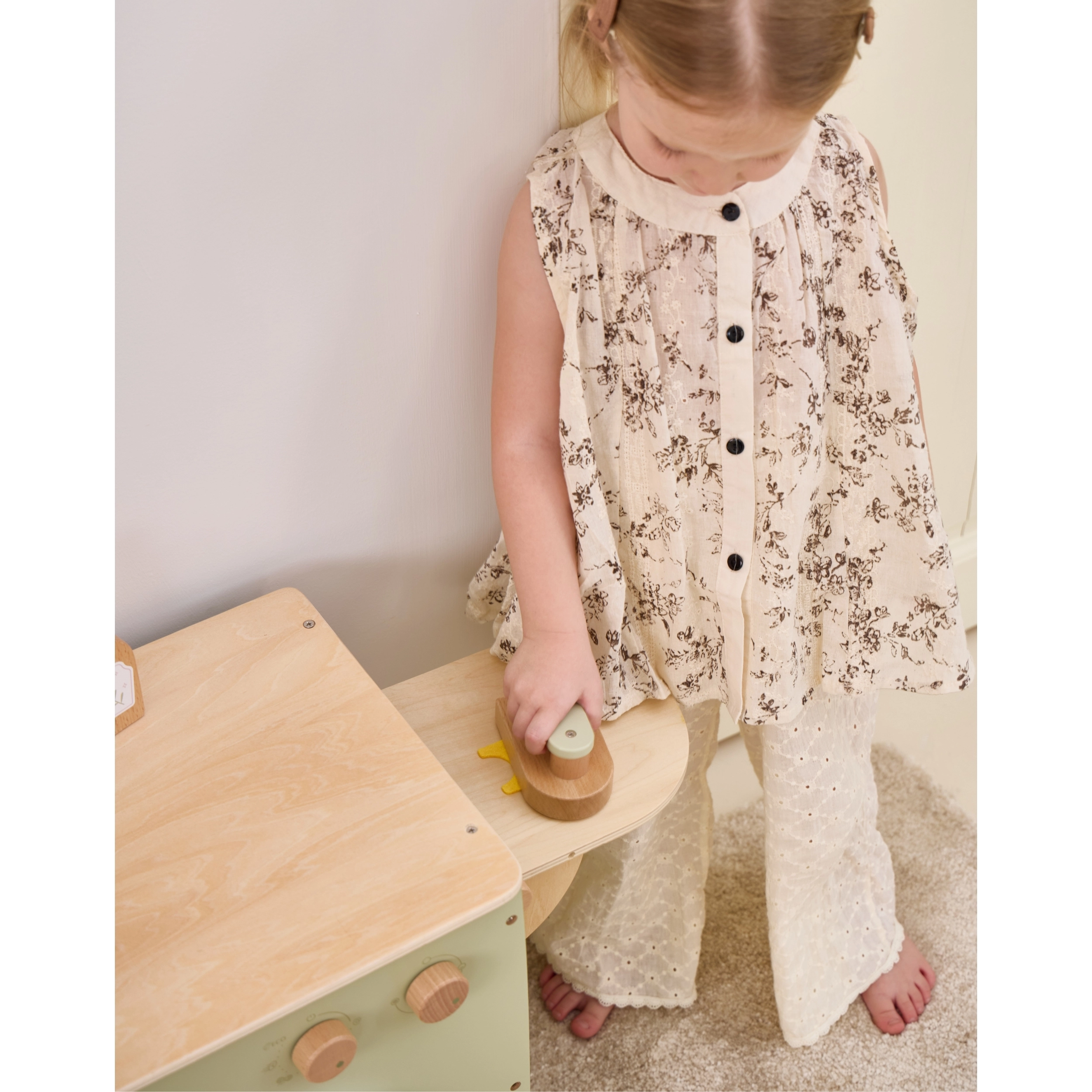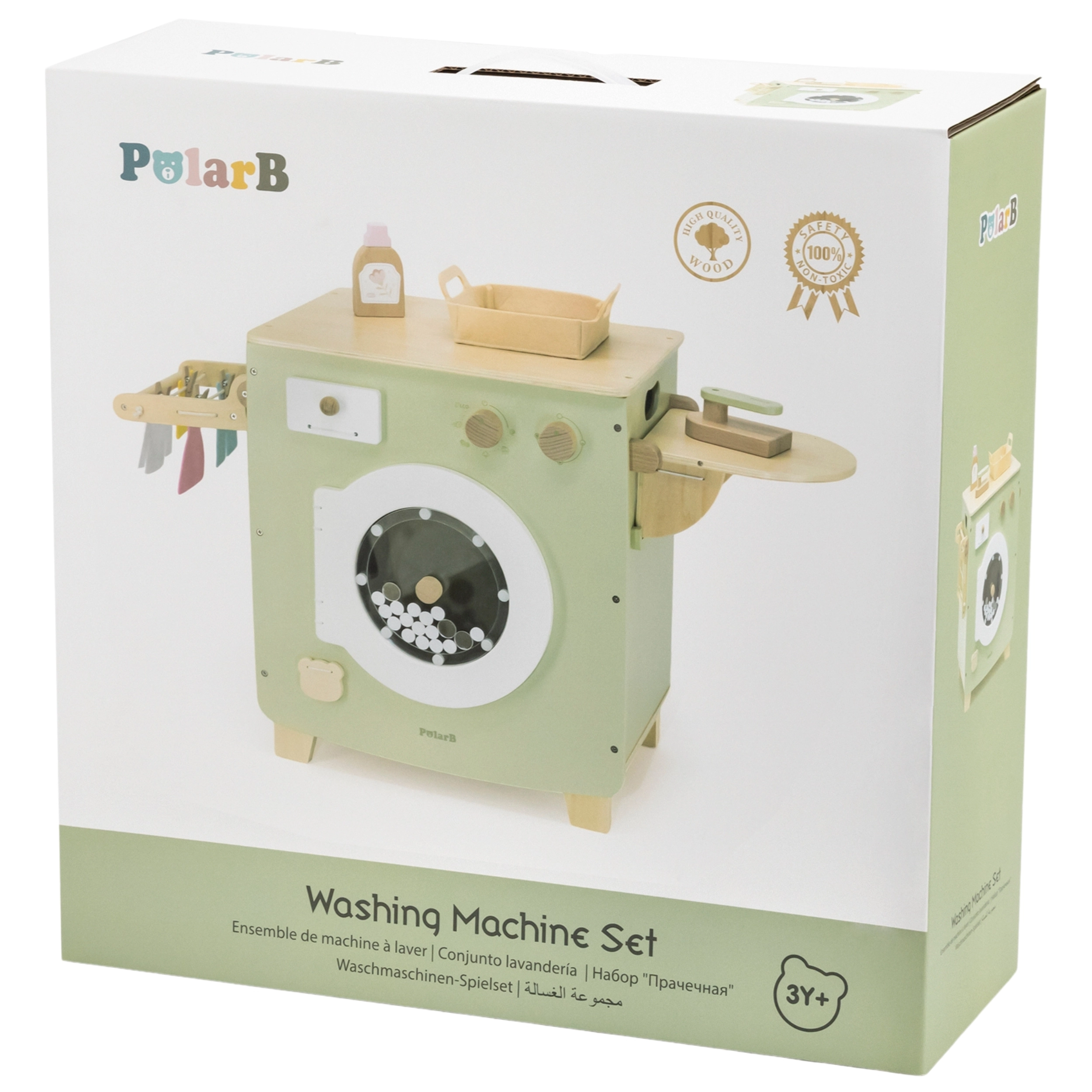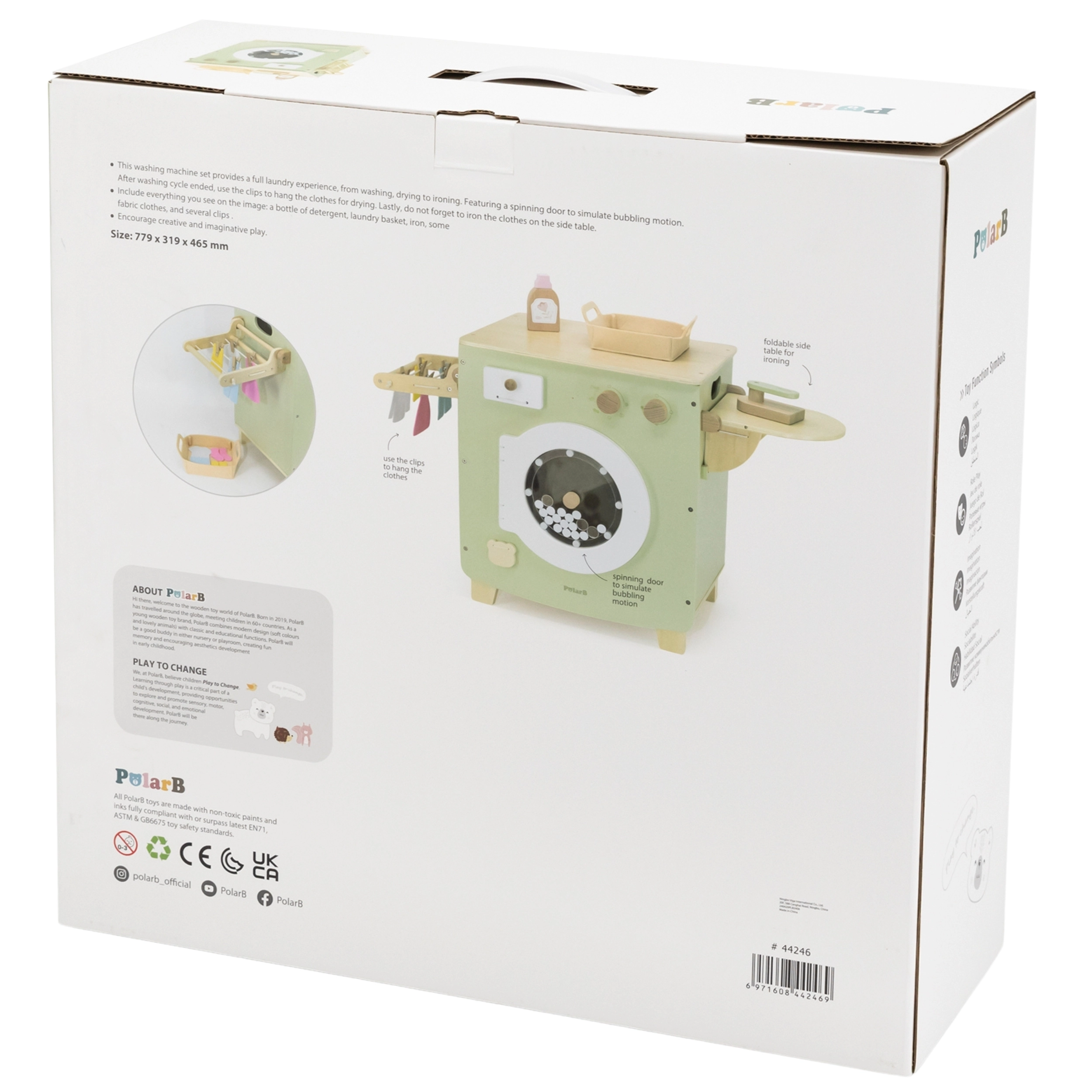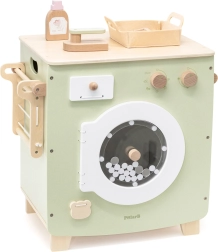 Ši kokybiška medinė skalbimo mašina švelnios pastelės žalios spalvos su natūraliais akcentais suteikia vaikams autentišką skalbimo, džiovinimo ir lyginimo patirtį. Valdymo ratukai, permatomos durelės ir šoninis sulankstomas džiovintuvas su segtukais užtikrina ilgas prasmingo žaidimo valandas ir gebėjimų lavinimą.