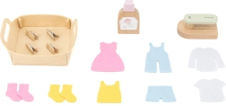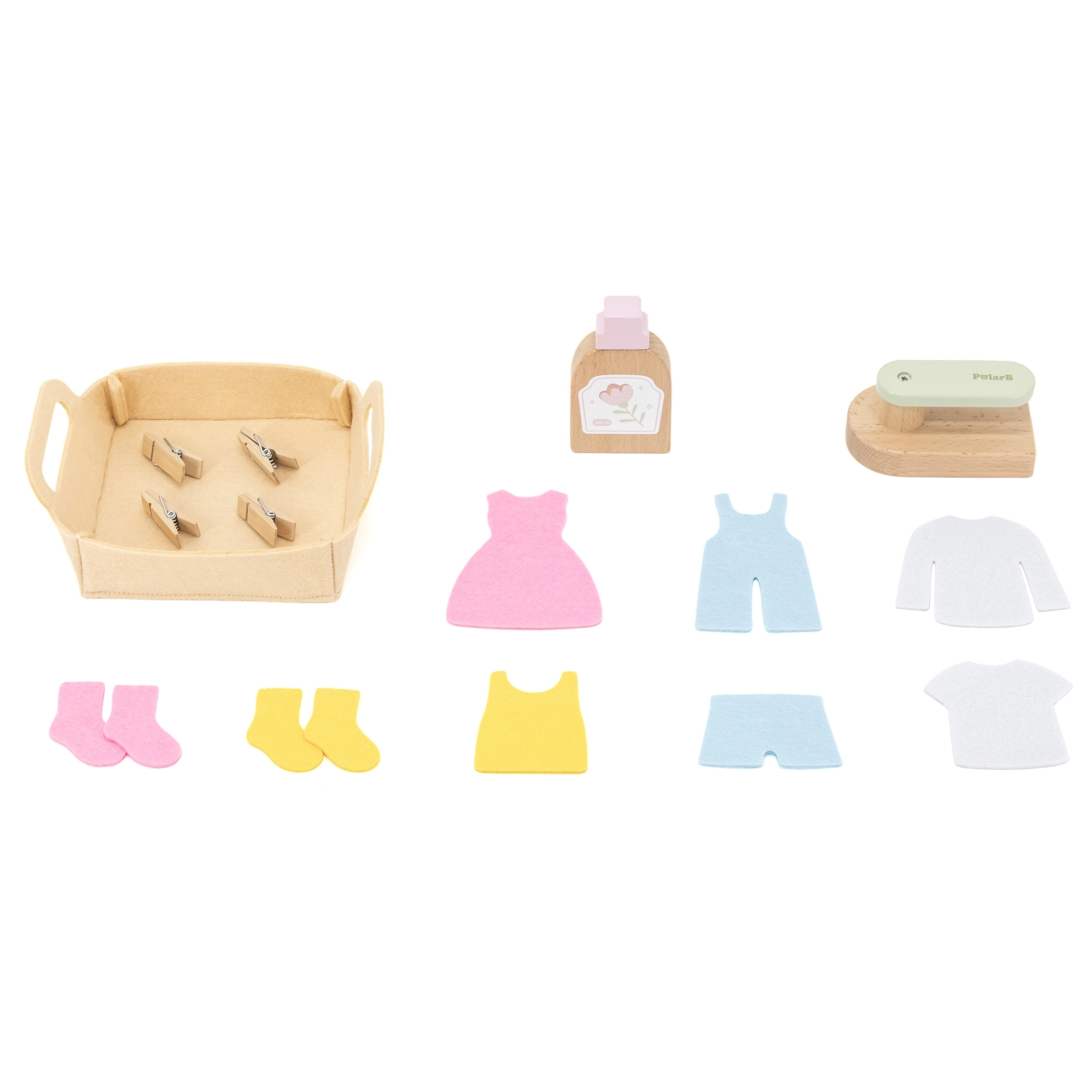 Komplekte taip pat yra tokie priedai kaip skalbiklis, skalbinių krepšys, veltiniai drabužėliai ir medinis lygintuvas. Dėl tvirto medinio korpuso ir lygių briaunų žaislas yra saugus ir patvarus kasdieniam žaidimui.