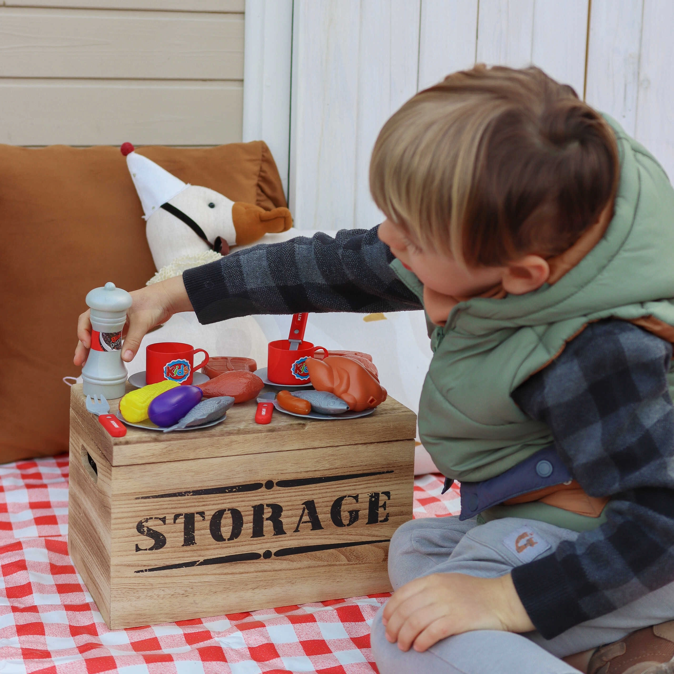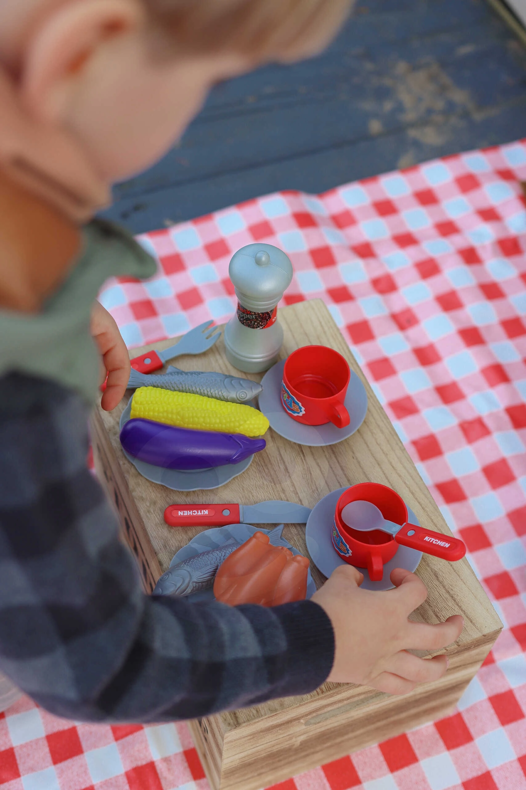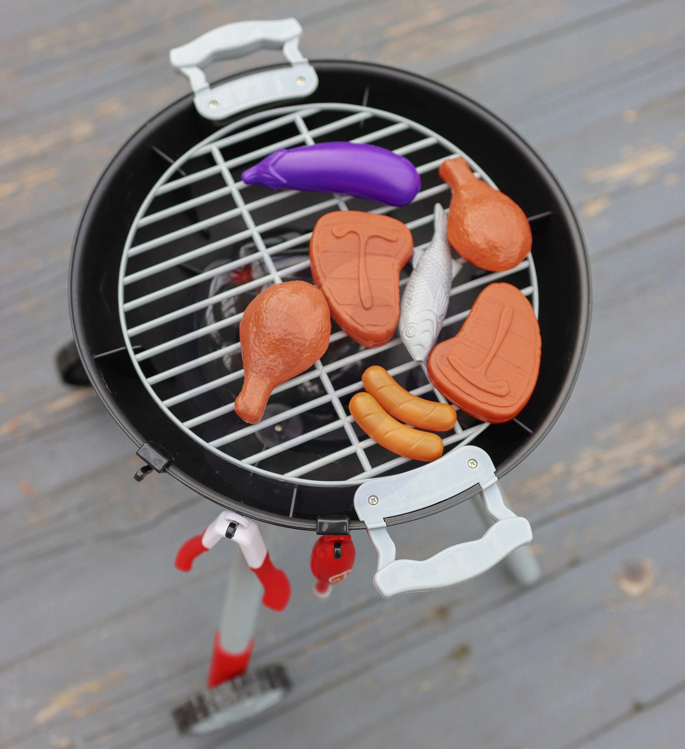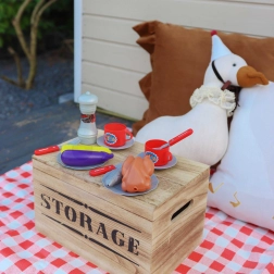 Dešrelės, kepsniai, vištiena, žuvis, kukurūzai, baklažanas, lėkštės, stalo įrankiai, puodeliai, pipirų malūnėlis, žnyplės ir žiebtuvėlis – viskas viename komplekte ilgoms žaidimo valandoms.