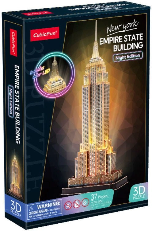 Pastatykite ikoninį Niujorko simbolį su elegantišku LED apšvietimu. Ši šviečianti 3D dėlionė Empire State Building iš Night Edition leidimo, sukurta CubicFun, siūlo 37 tikslias detales iš patvarios putos su atspausdintu laminatu, kurias lengvai išlaušite ir surinksite be klijų ar žirklių. Baigtas modelis yra puiki kambario dekoracija ir kolekcinis eksponatas architektūros gerbėjams.