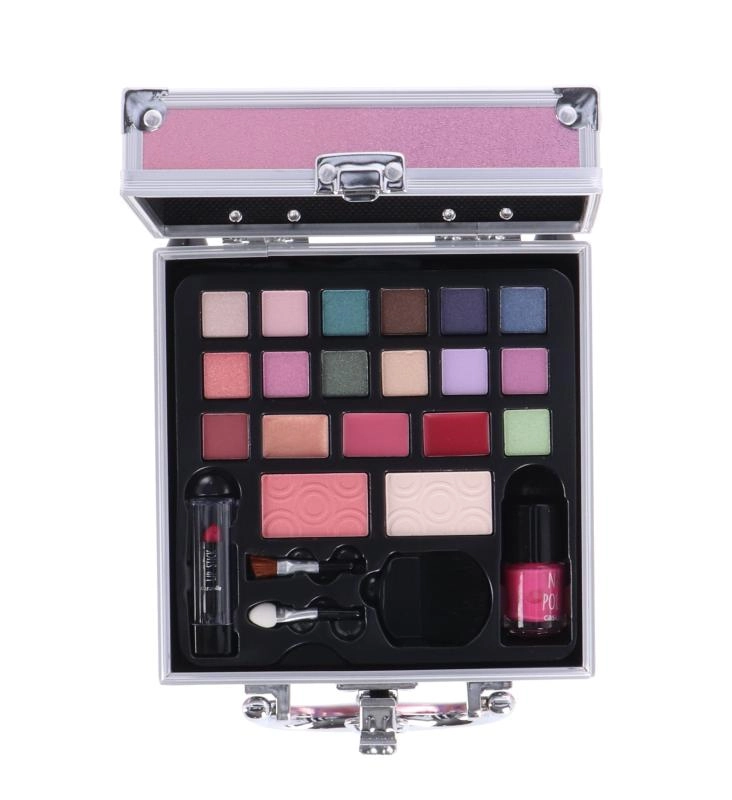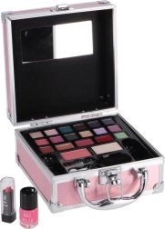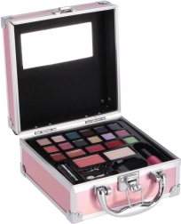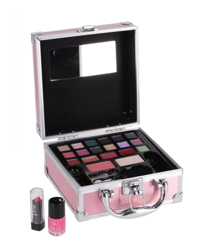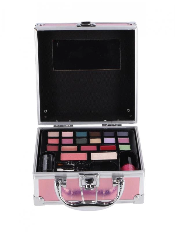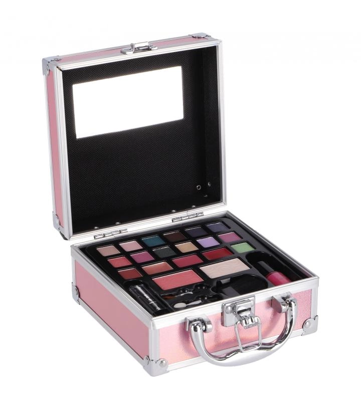 Stilingas rožinis mini makiažo lagaminėlis kasdieniam ir kelioniniam naudojimui. Jame yra viskas, ko reikia greitam makiažui: 14 akių šešėlių, blizgios lūpų spalvos, skaistalai ir pudra, lūpų dažai bei nagų lakas. Patogiam naudojimui namuose ir keliaujant pridedama praktiška veidrodėlė, skaistalų šepetėlis, kempininis aplikatorius ir lūpų šepetėlis.