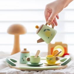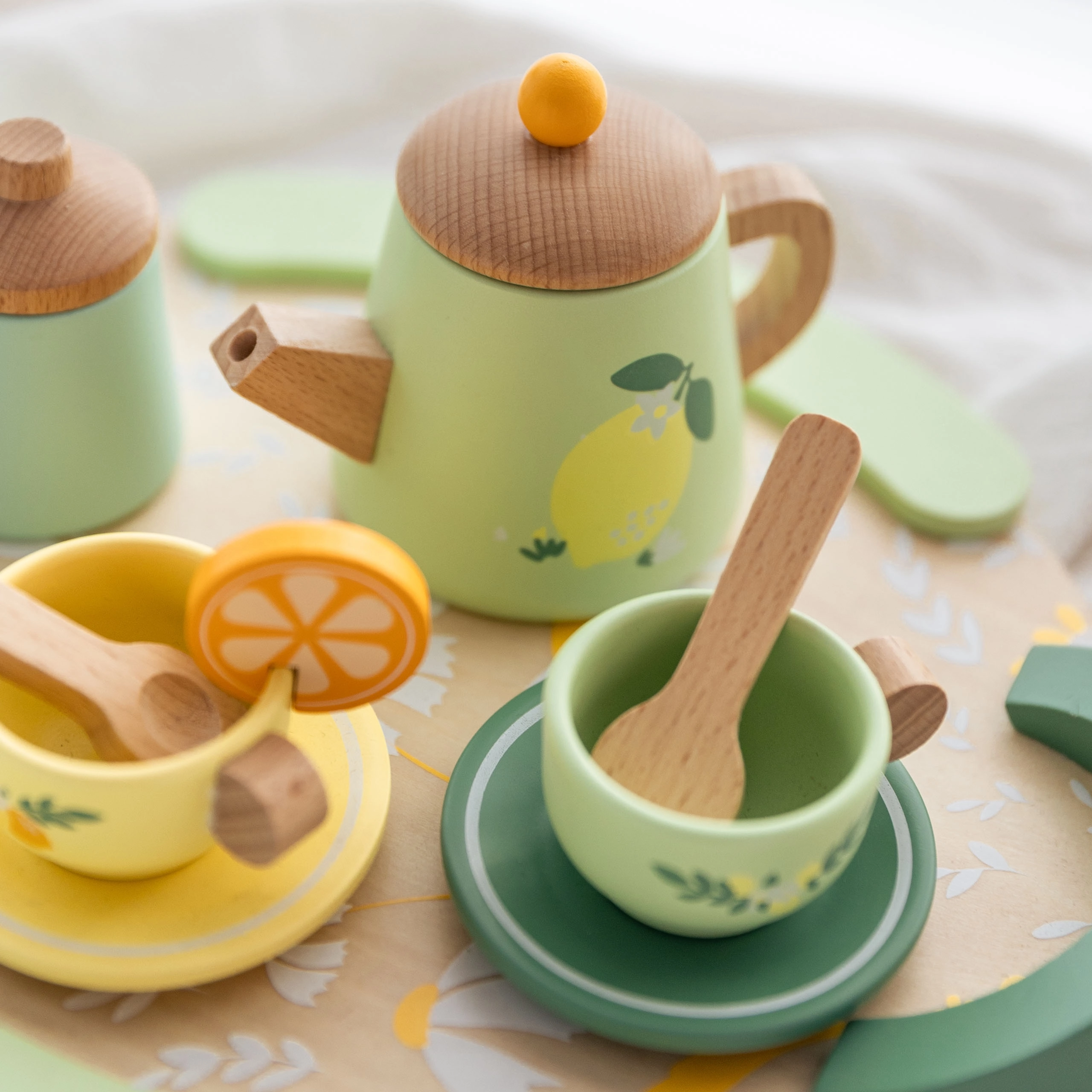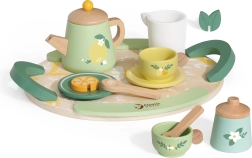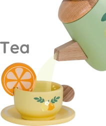 Padovanokite vaikams magišką arbatos ritualą su elegantišku mediniu rinkiniu švelnių pastelinių atspalvių. Rinkinys puoštas vaisių ir gėlių motyvais ir apima arbatinuką, puodelius su lėkštutėmis, šaukštelius, pieno ir cukraus indelius bei didelį padėklą su rankenėlėmis patogiam nešiojimui.