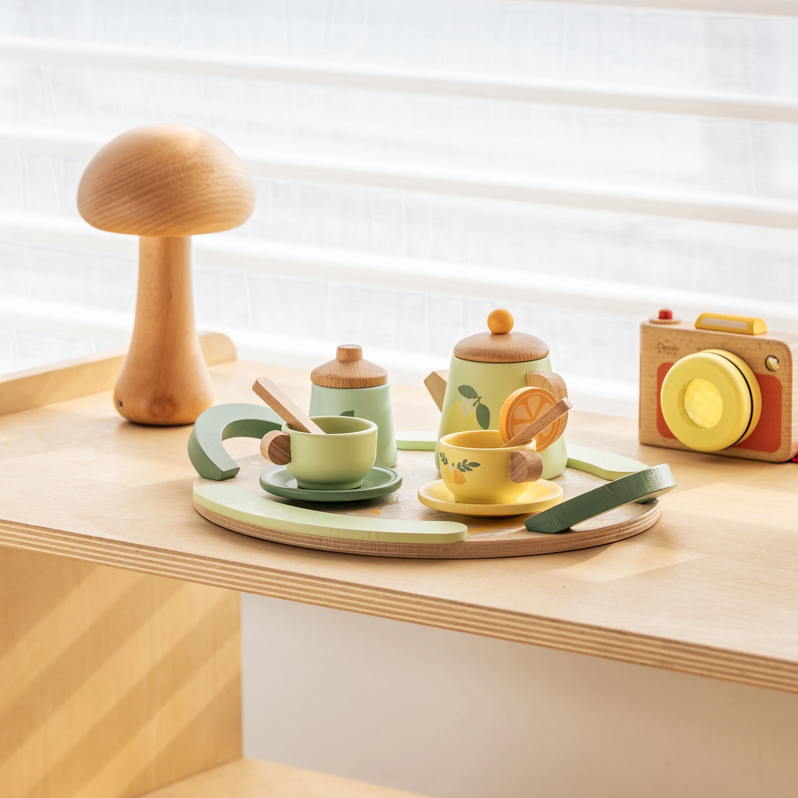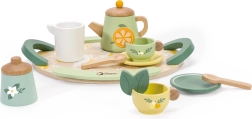 Žavus medinis arbatos rinkinys iš CLASSIC WORLD pradžiugins kiekvieną mažą šeimininką. Jame yra viskas stilingam arbatos vakarėliui – nuo arbatinuko ir puodelių iki padėklo su raštu. Dėl tvirtos medinės konstrukcijos, pastelinių spalvų ir saugaus, be aštrių kampų dizaino rinkinys idealiai tinka vaikams nuo 3 metų. Skatina vaizduotę, vaidmenų žaidimus ir smulkiąją motoriką.
