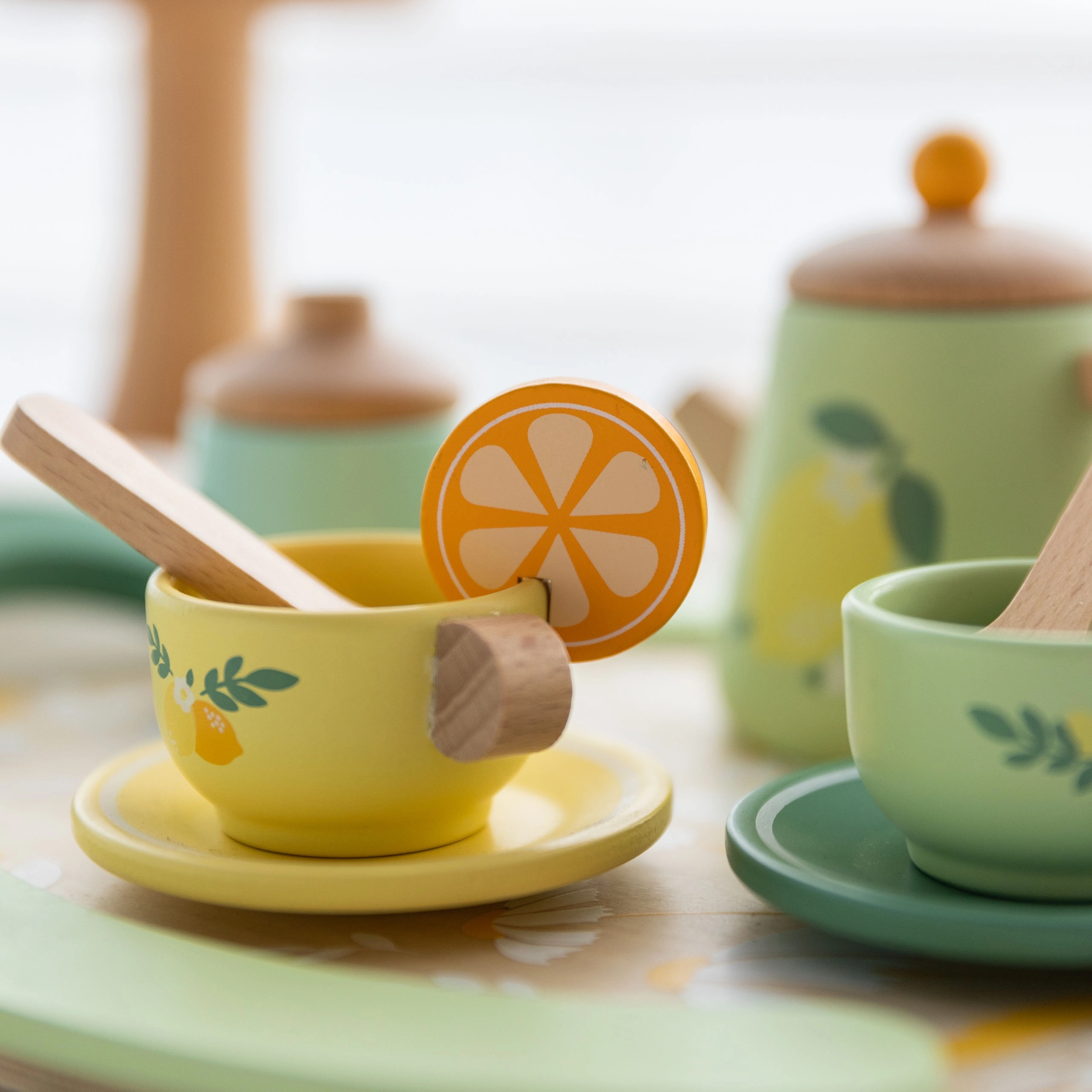 Pastelinė žalia ir geltona paletė su dailiomis citrusų ir gėlių detalėmis žadina vaizduotę ir paverčia rinkinį gražiu vaikų virtuvėlės akcentu.
