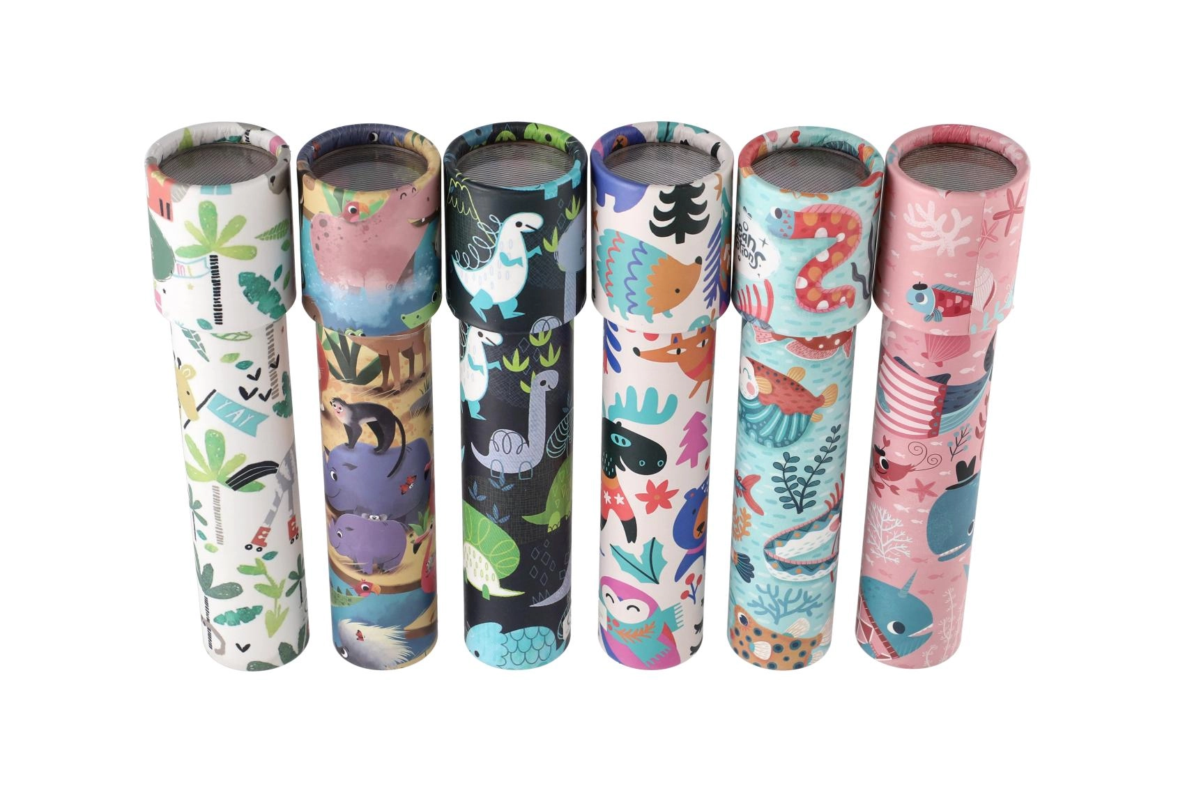 Linksmos gyvūnėlių iliustracijos paverčia kaleidoskopą patraukliu žaislu ir miela dovana mažiesiems tyrinėtojams.
