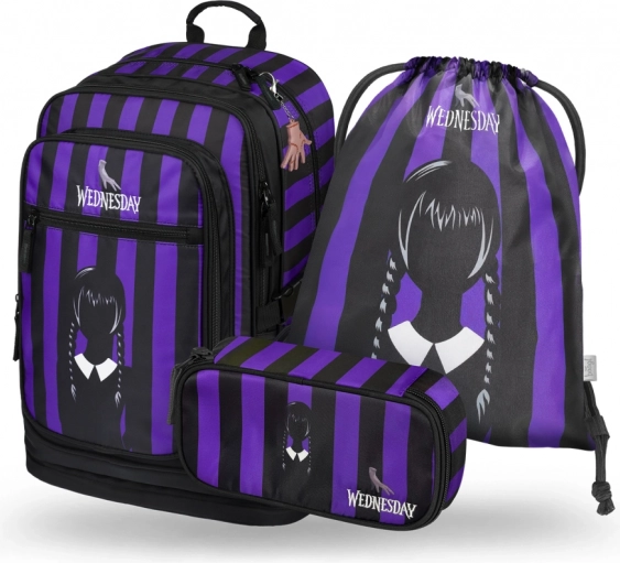 Cubic Wednesday rinkinį sudaro stilinga kuprinė, praktiškas penalas ir batų maišelis – visa tai modernaus dizaino su juodomis ir violetinėmis juostomis. Kuprinė sukurta atsižvelgiant į ergonominius poreikius, o penalas ir maišelis padeda tvarkingai susidėti mokyklines priemones ir daiktus laisvalaikiui.