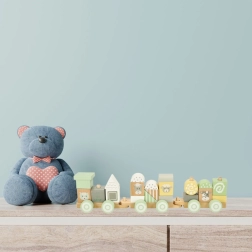 Glotniai nušlifuotos medinės detalės su netoksiškais pastelinių spalvų dažais ir gyvūnėlių spaudiniais tarnaus daugelį metų žaidimų.