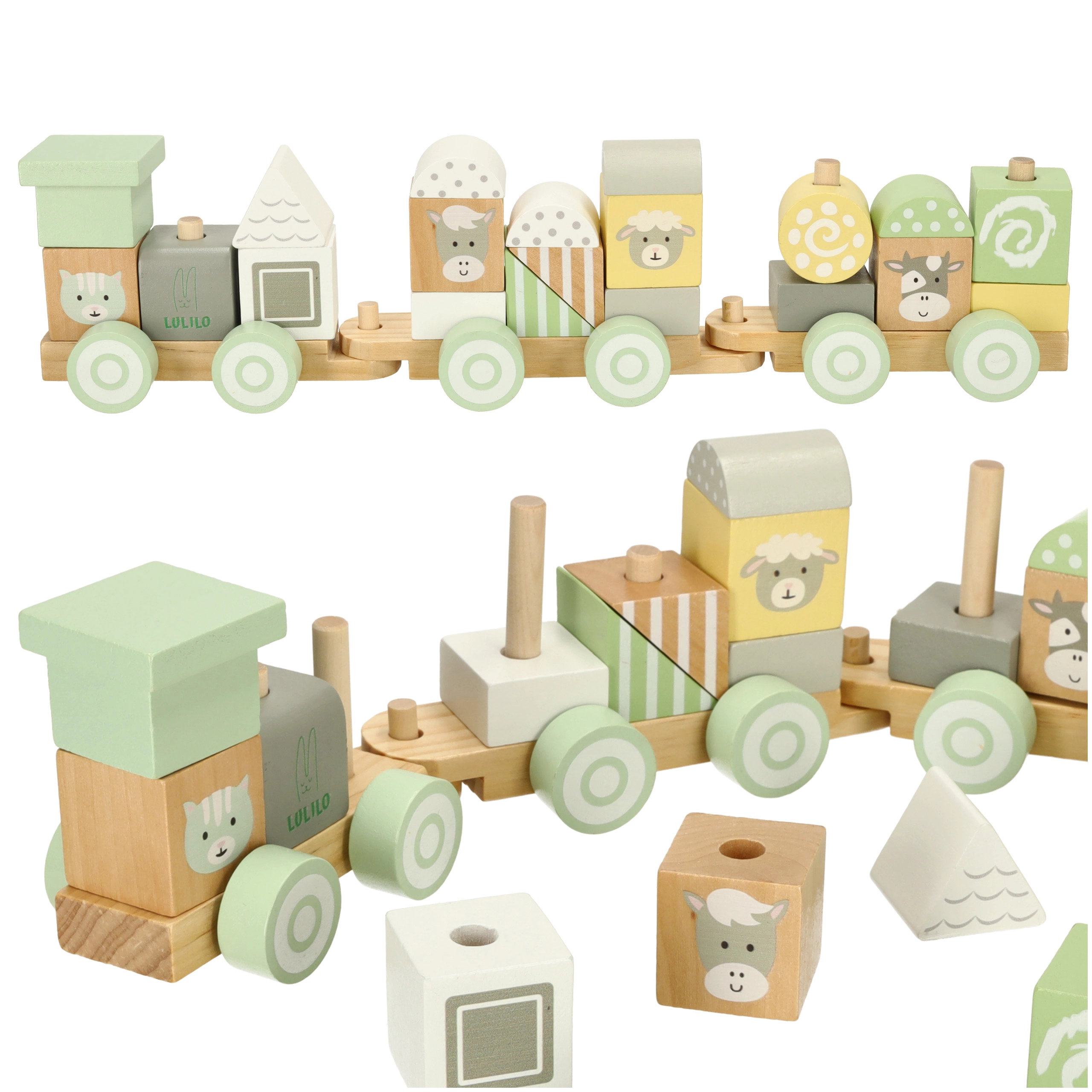 Pastelinis medinis traukinukas LULILO – idealiai tinka mažiesiems konstruktoriams. Vaikai gali laisvai derinti kaladėles ir kurti vis naujus sąstatus arba naudoti kaladėles atskirai. Kiekviena detalė glotniai nušlifuota ir nudažyta netoksiškais dažais švelnių atspalvių paletėje, papildyta mielais gyvūnėlių motyvais.