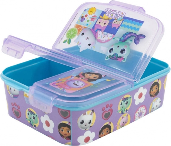Dėžutę puošia spalvingi Gabby's Dollhouse personažai ir gėlės, kurie patrauks kiekvieno vaiko dėmesį.