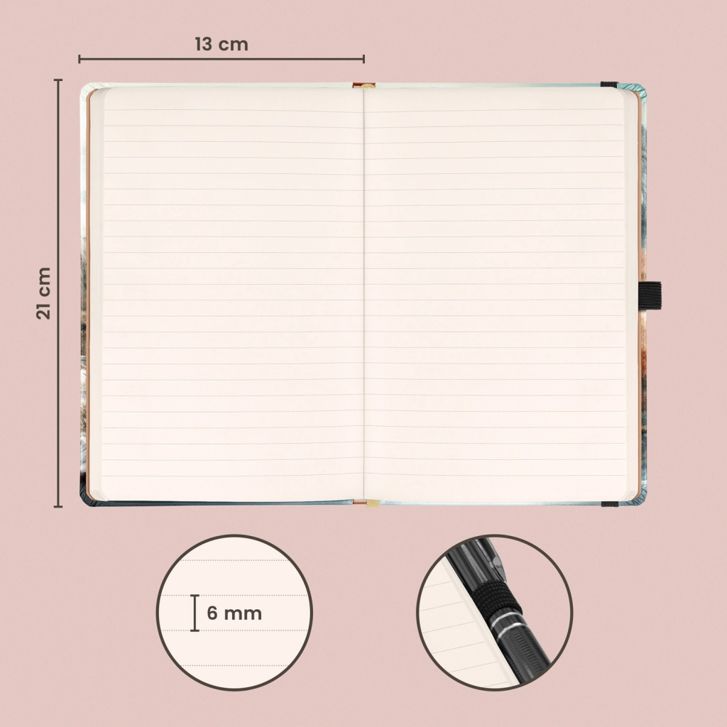 Praktiškas 13 × 21 cm formatas telpa į daugumą kuprinių ir rankinių, todėl tinka darbui, mokslams ir kelionėms. Vidinė kišenė apsaugos laisvus lapelius, vizitines ar lipdukus, kad jūsų užrašai visada būtų puikiai sutvarkyti.
