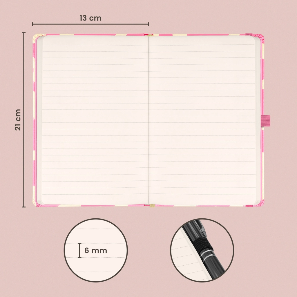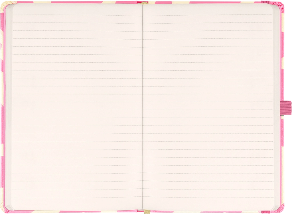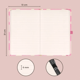 Stilinga kasdienė rožinė užrašų knygelė su kietais viršeliais, užsegimu gumele, rašiklio kilpele ir vidine kišene. Siūlo 172 taškuotus puslapius ant geltono popieriaus patogiame 13 × 21 cm formate jūsų idėjoms, pastaboms ir dienoraščiui.
