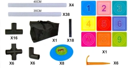 - Taikinys su laukeliais, 8 diskai, krepšys, vamzdeliai 40 cm × 4, vamzdeliai 35 cm × 38, jungtys × 28, lipnios juostelės × 18, plastikiniai kuoliukai × 6