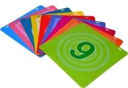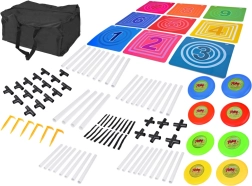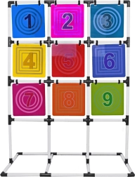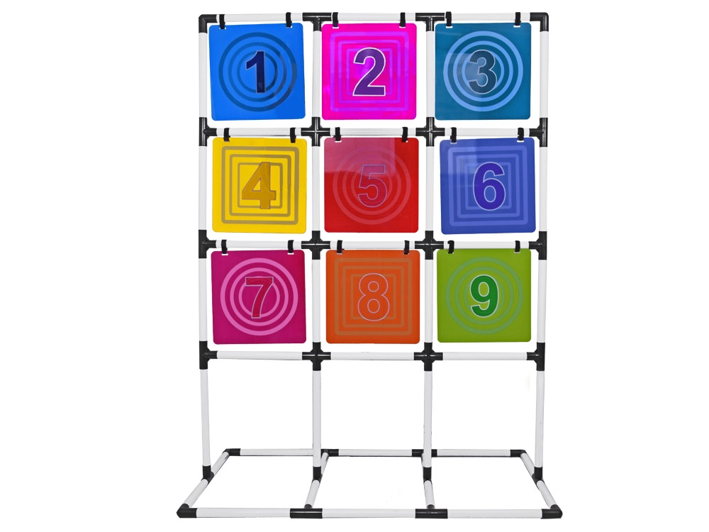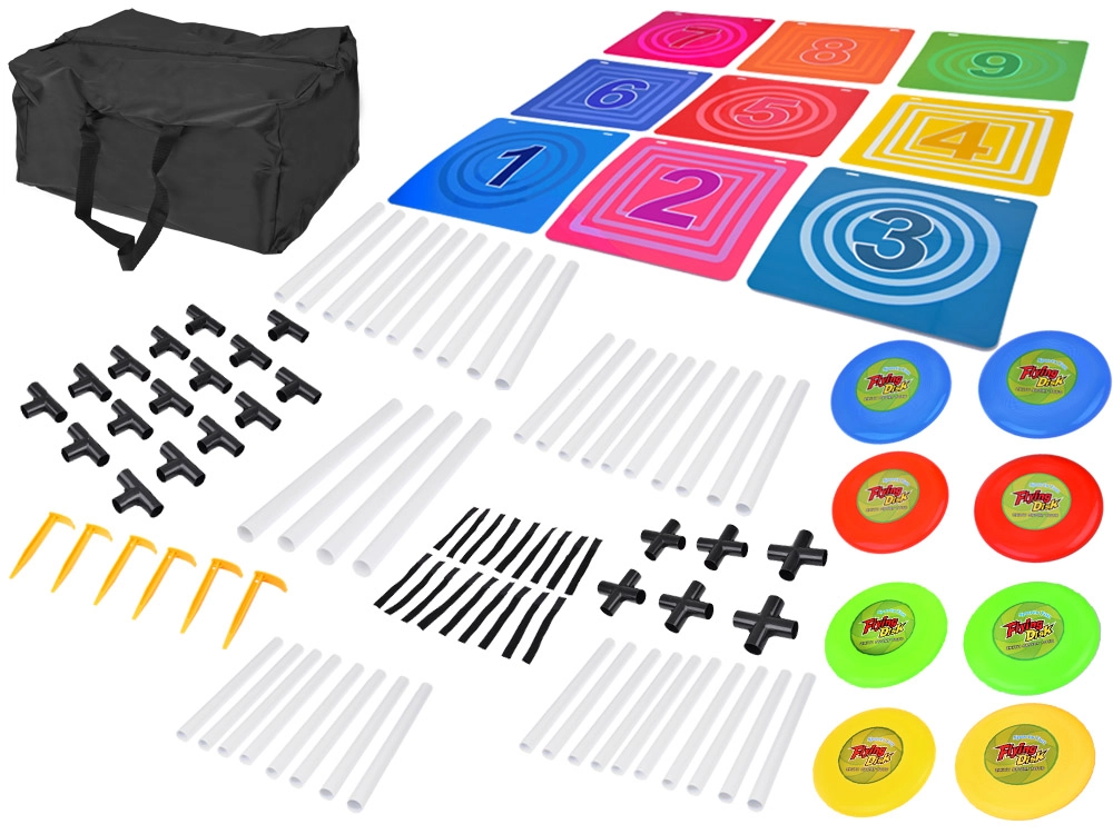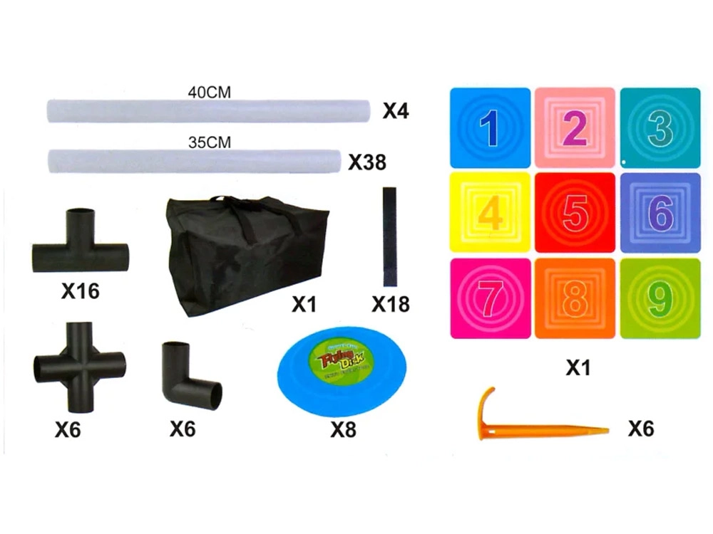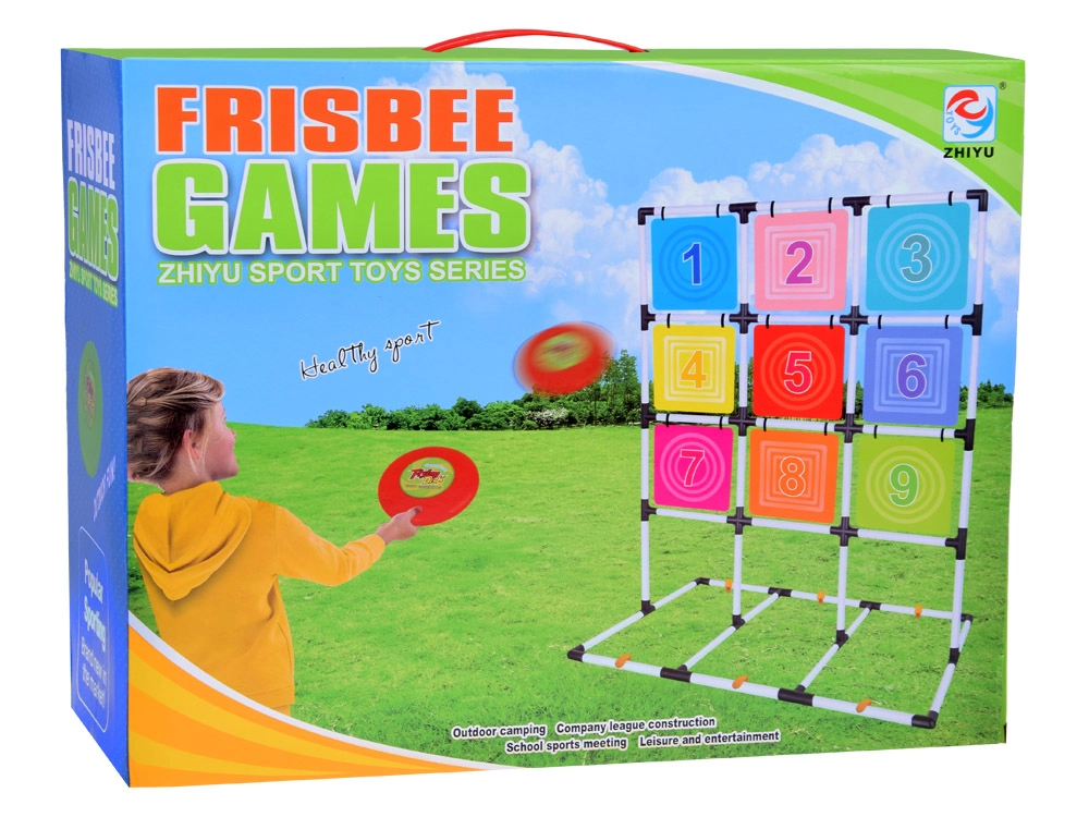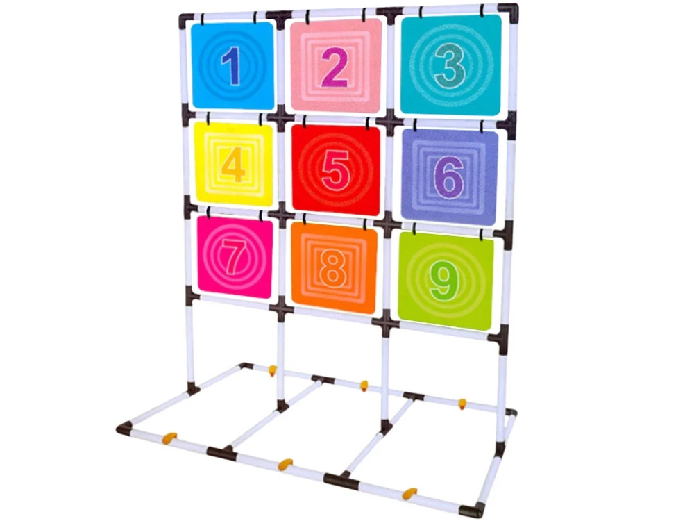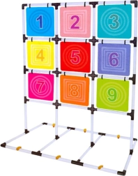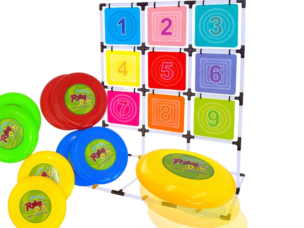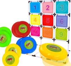 Šis pilnas diskų mėtymo į taikinį rinkinys suteikia aktyvų užsiėmimą vienam ar keliems žaidėjams. Stabilus rėmas su devynių spalvotų, sunumeruotų laukelių tinkleliu skatina skaičių pažinimą, varžomąjį nusiteikimą ir komandinę dvasią. Žaidimas lavina smulkiąją ir stambiąją motoriką, atstumo pajautimą ir metimo tikslumą.