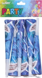 Pradėkite šventę su linksmomis trimitėlėmis su ryklo motyvu! Pakuotėje yra 6 vnt., ilgis 20 cm – idealus priedas vaikų gimtadieniui ir teminiams vakarėliams.