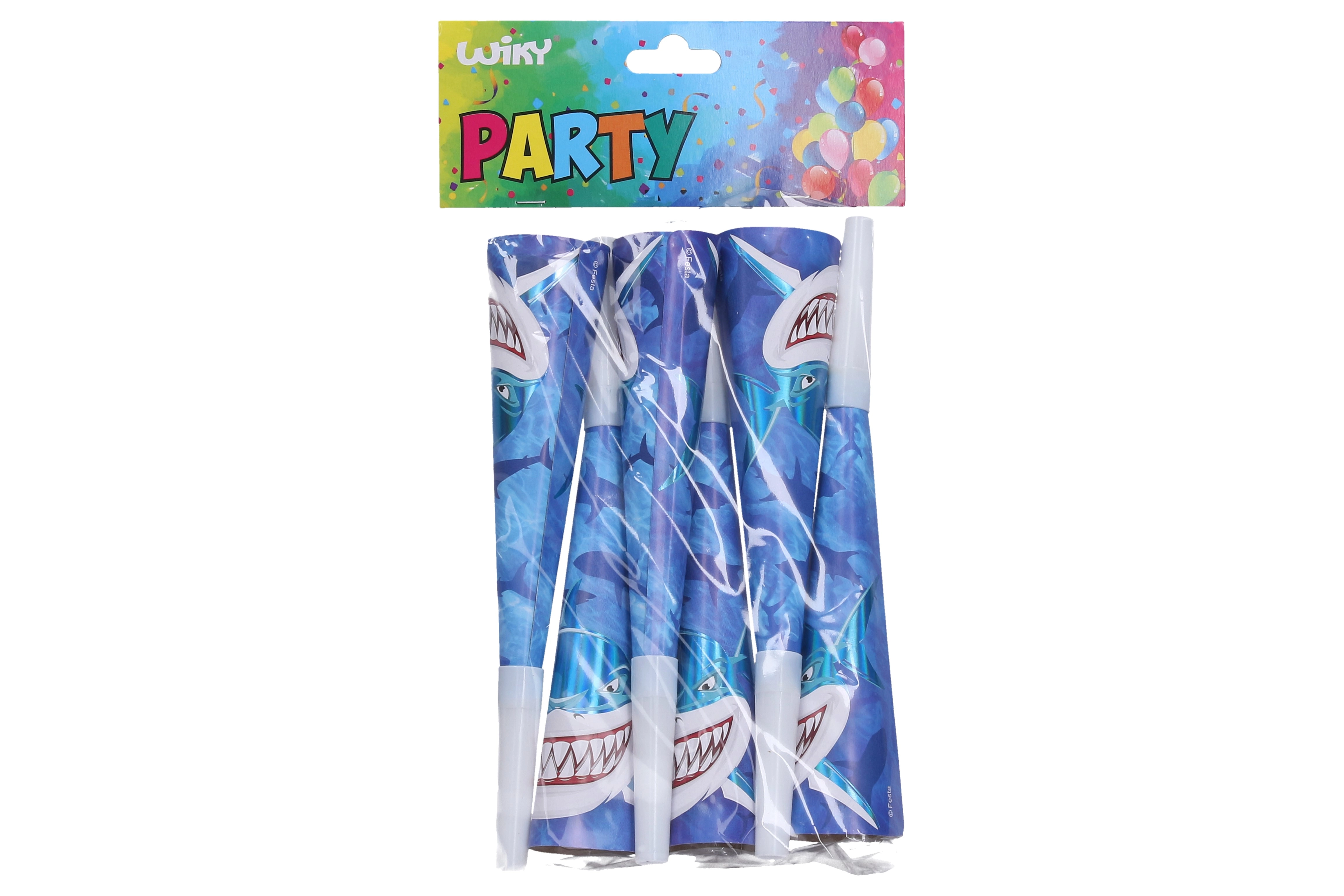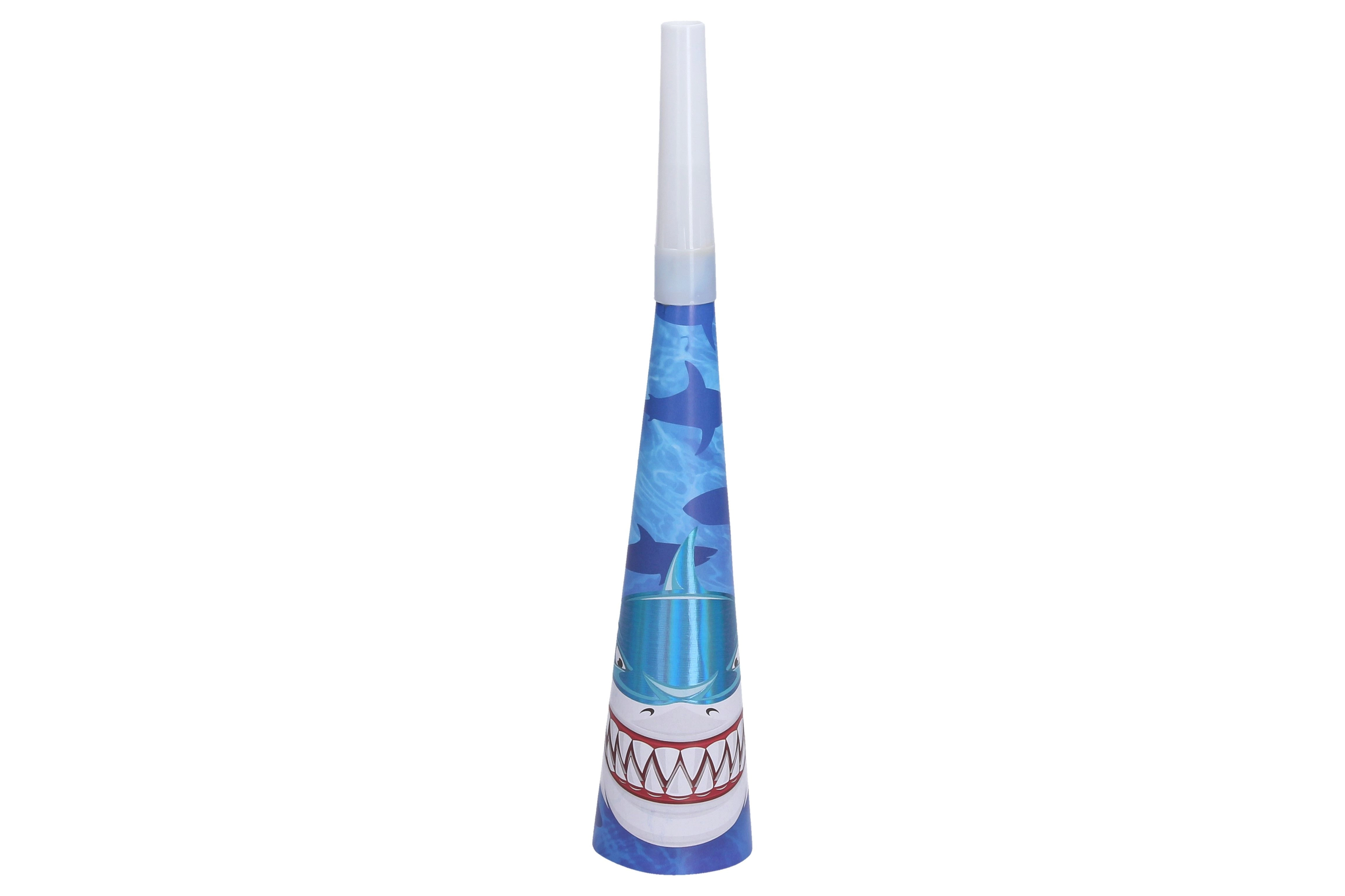 Suteikite kiekvienai šventei tinkamą nuotaiką su vakarėlio trimitėlėmis ryklo motyvu. Dėl 20 cm ilgio jas patogu laikyti net mažesniems vaikams ir jas lengva naudoti – tereikia pūstelėti ir pramogos prasideda.