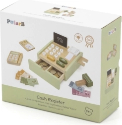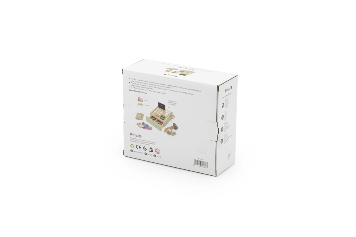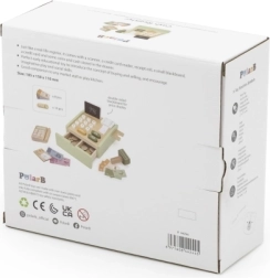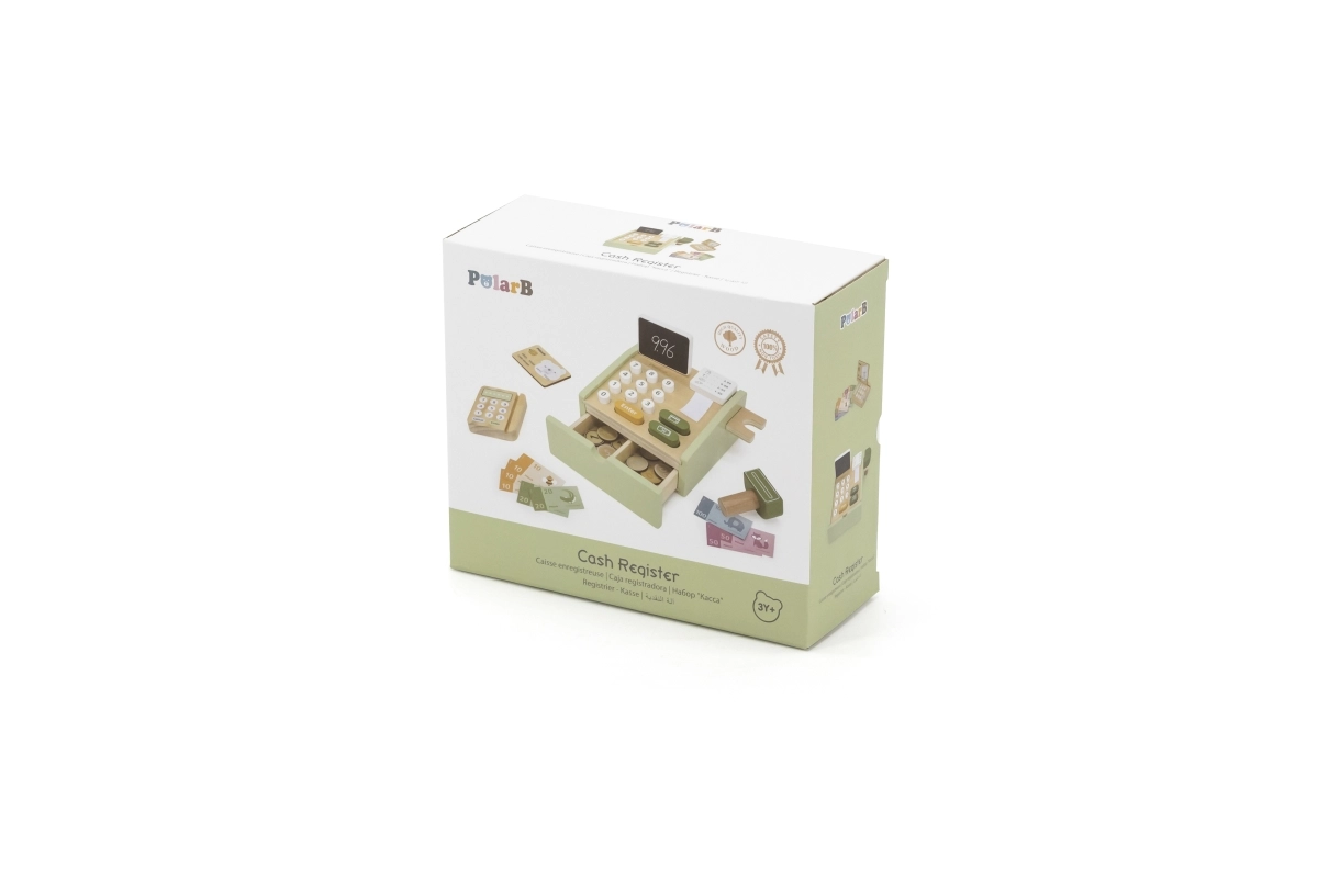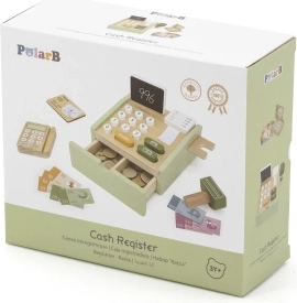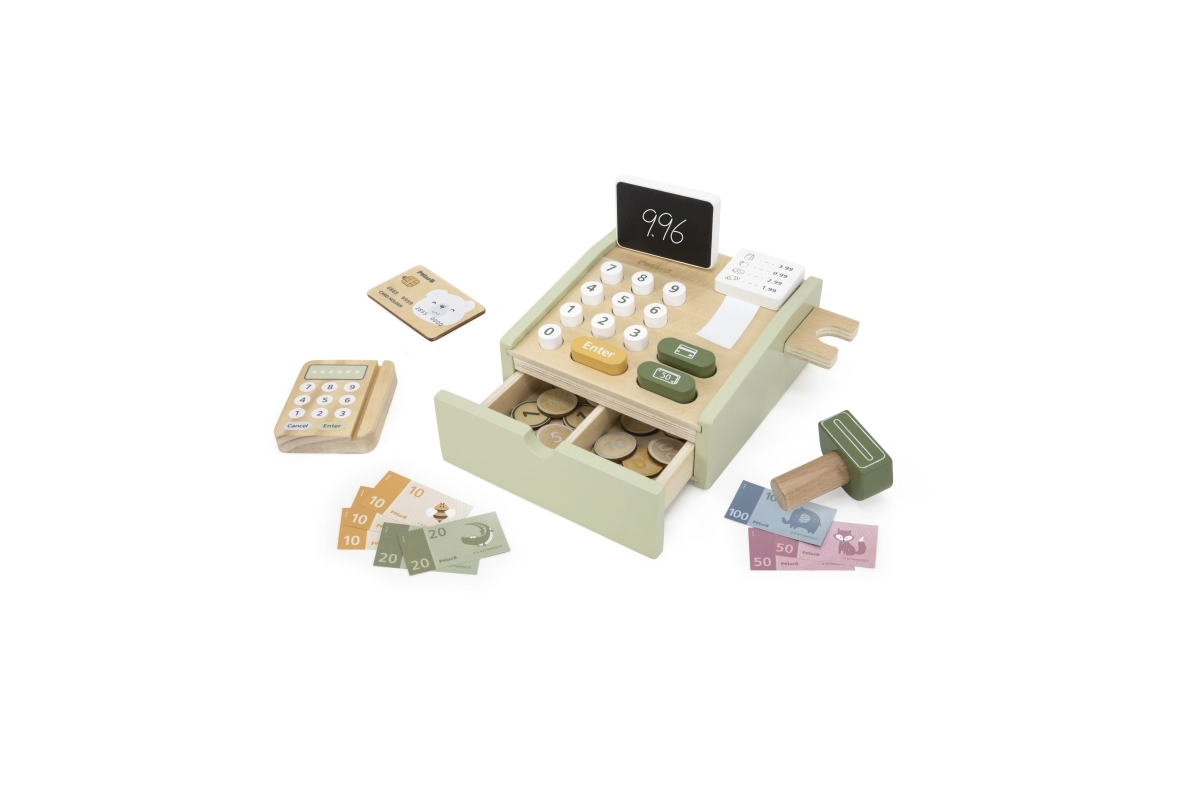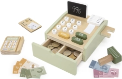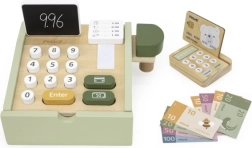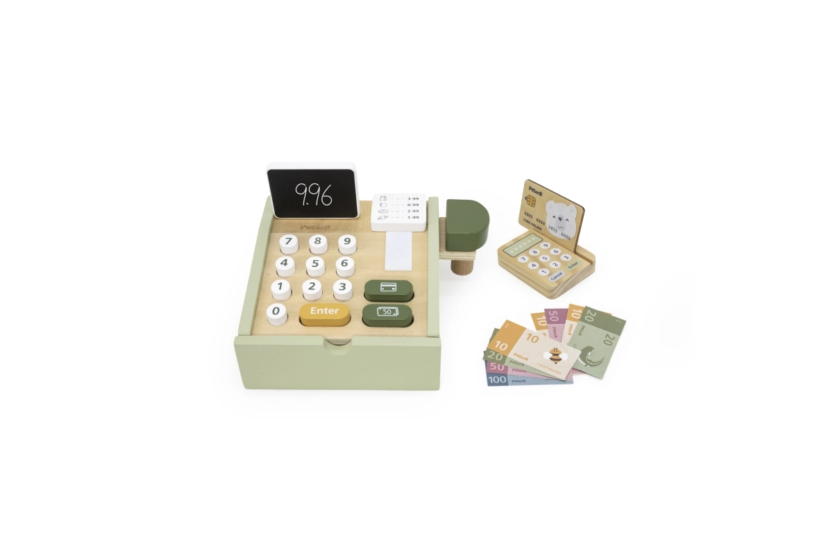 Medinis kasos aparatas malonios žalios spalvos – puikus edukacinis žaislas vaikams nuo 3 metų. Jame yra funkcionalūs elementai, tokie kaip ištraukiamas stalčiukas, mygtukai, skaitytuvas, kortelių terminalas ir popieriaus ritinys, kurie ištikimai atkuria tikrą kasą. Taip pat yra dvispalvė mini lentelė sąskaitoms užrašyti.