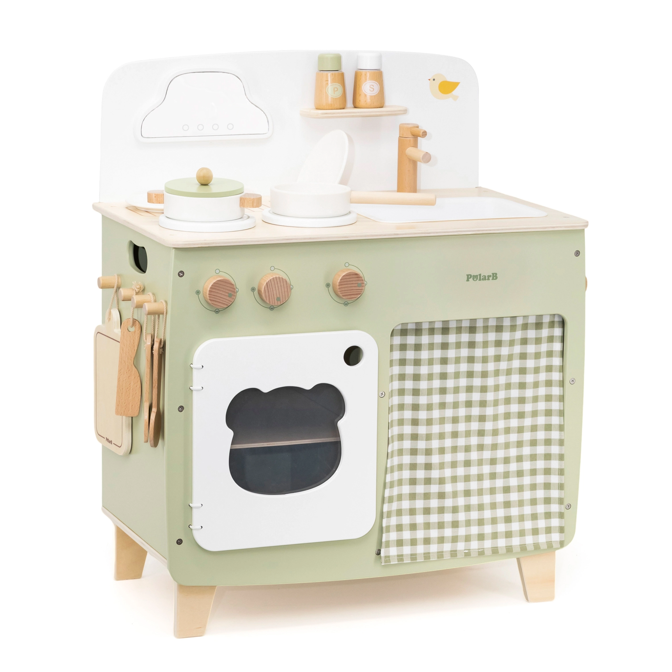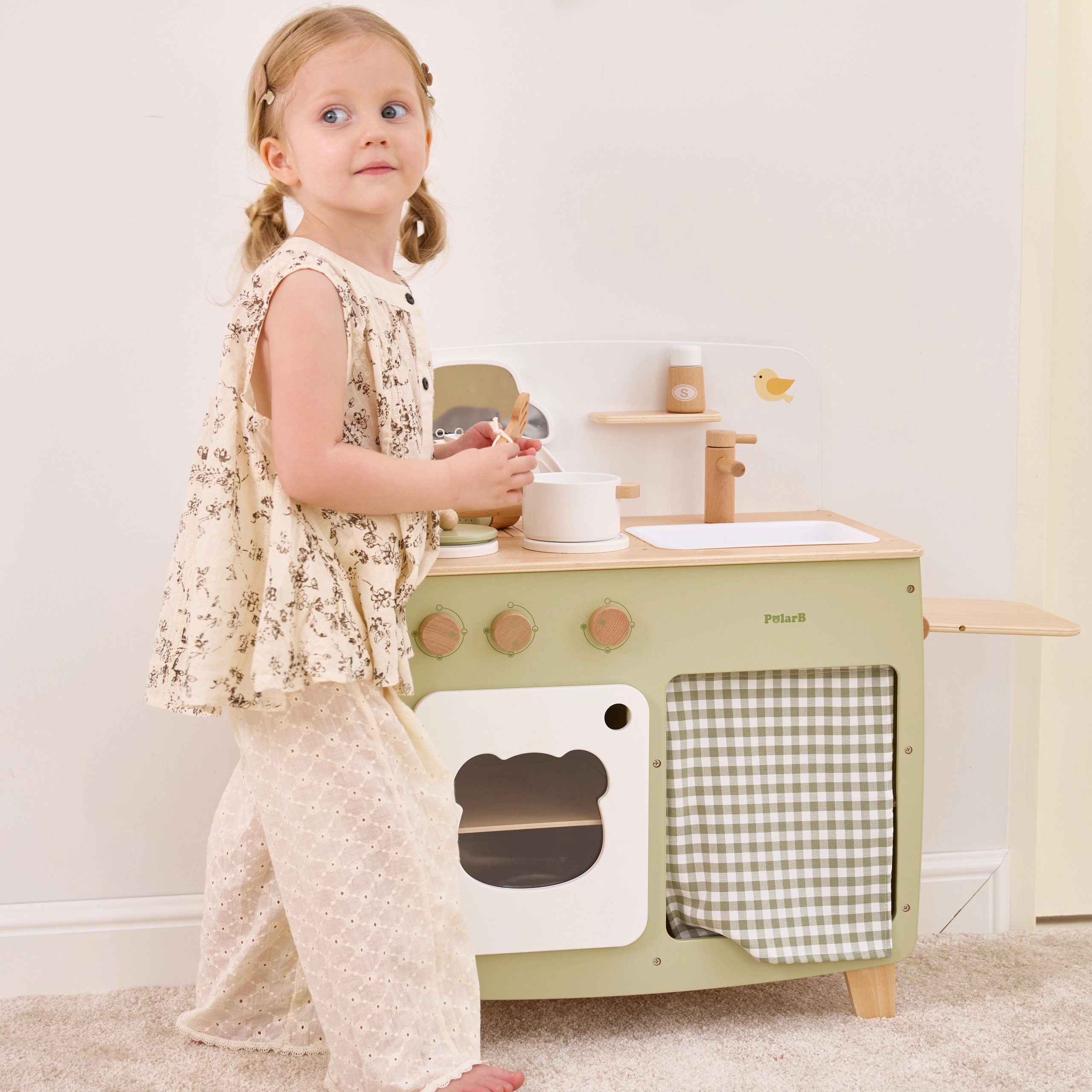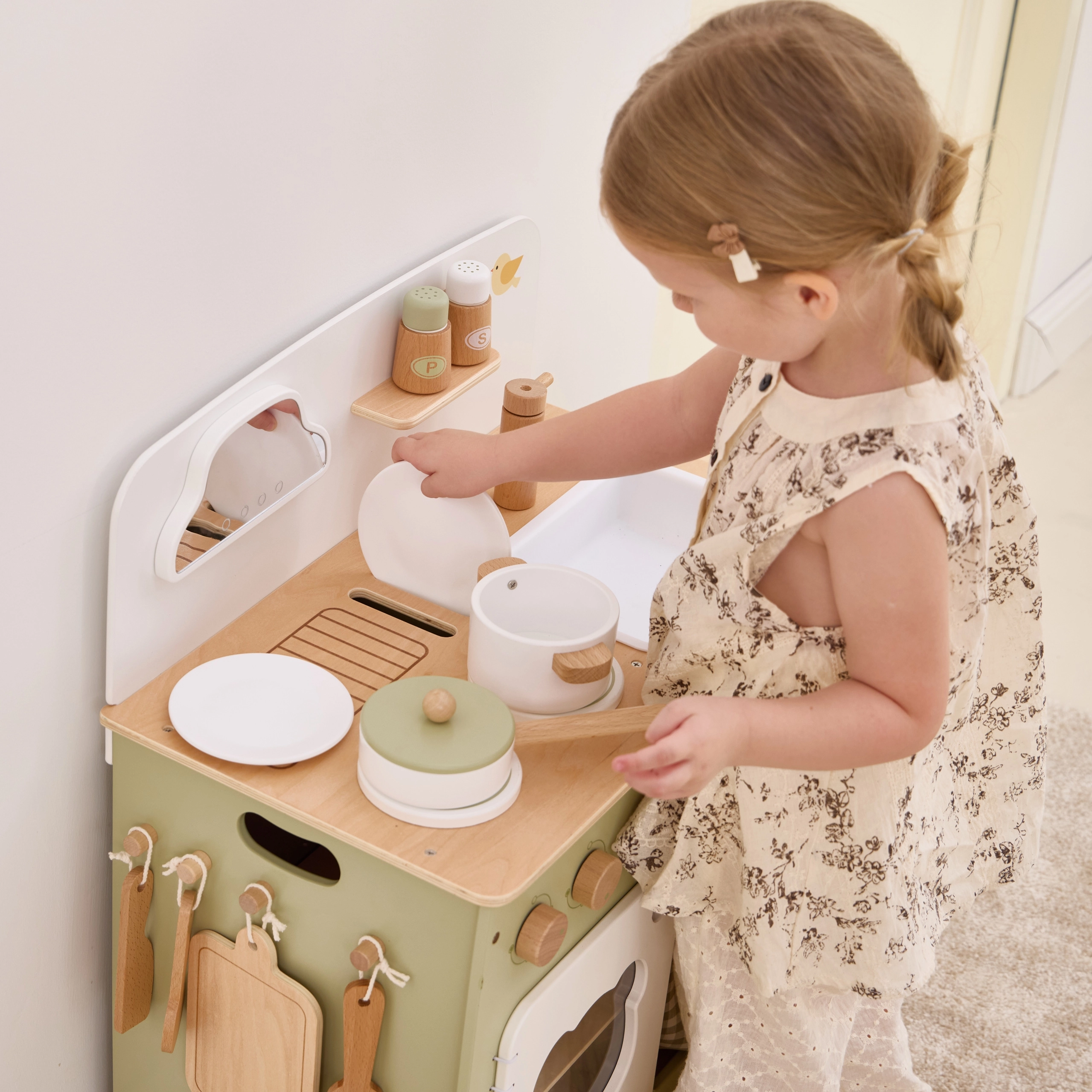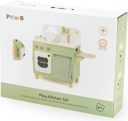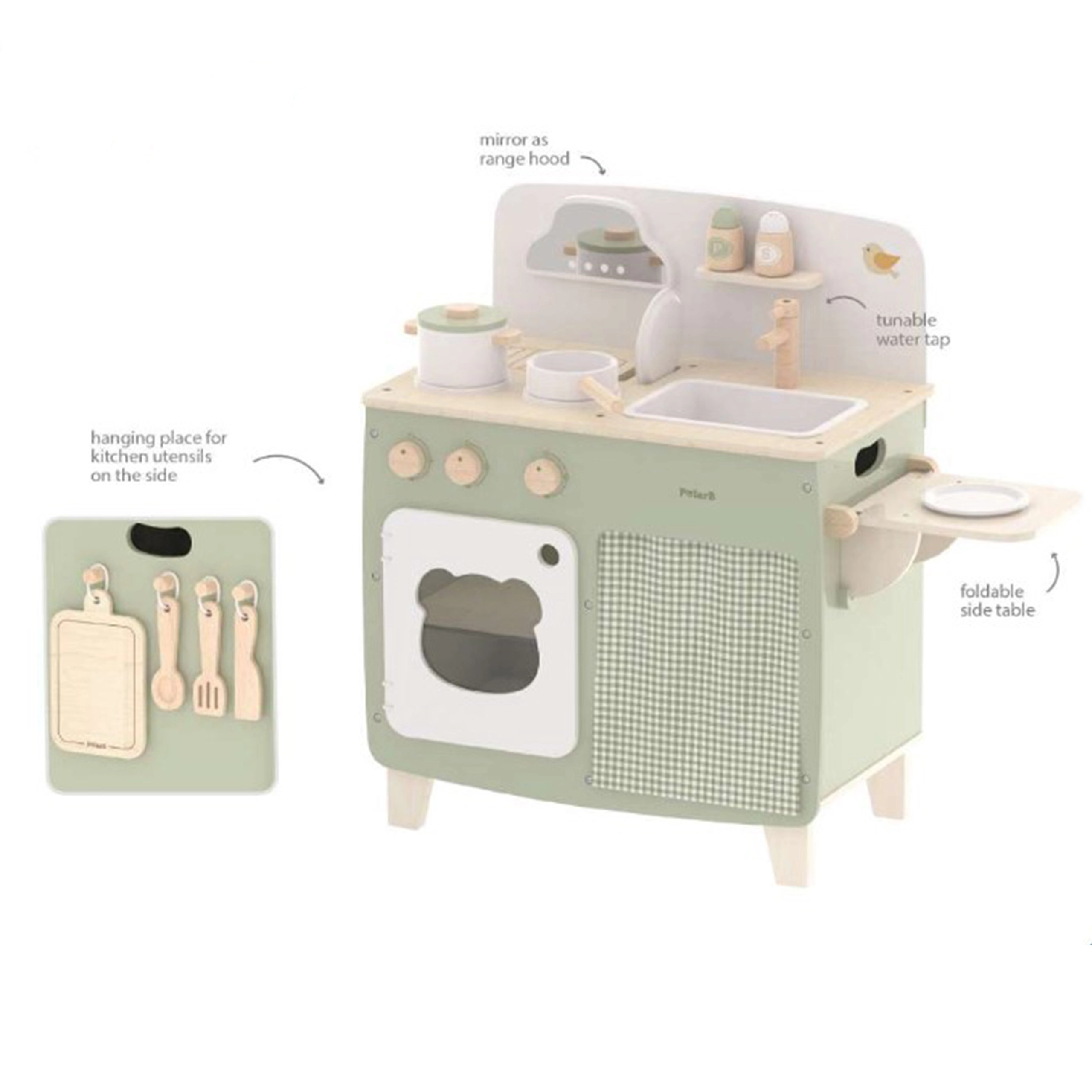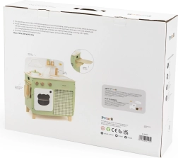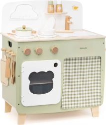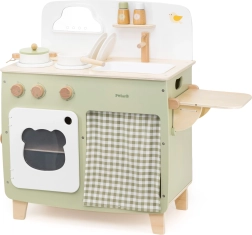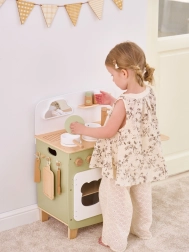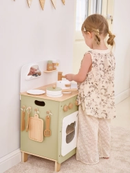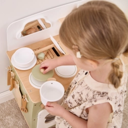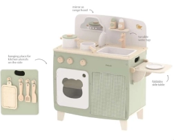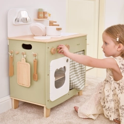 Stilinga vaikiška virtuvėlė jaukių natūralių ir žalių atspalvių suteiks vaikams realistišką gaminimo patirtį. Dėl tvirto medinio korpuso, pasukamų mygtukų, kriauklės ir orkaitės mažieji virėjai mėgausis valandomis saugaus ir kūrybiško žaidimo. Praktiškas nuleidžiamas šoninis pultas praplečia darbo zoną pjaustymui ar „valgymui“, o spintelė su užuolaidėle paslėps visus lobius.