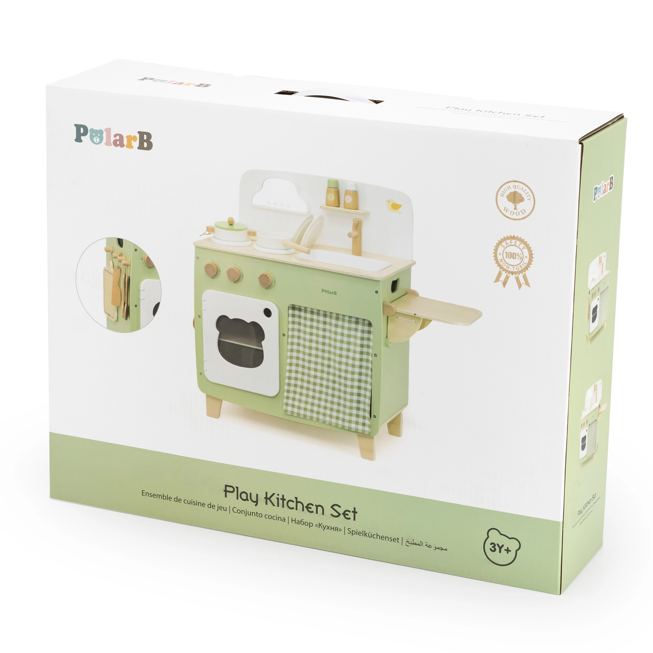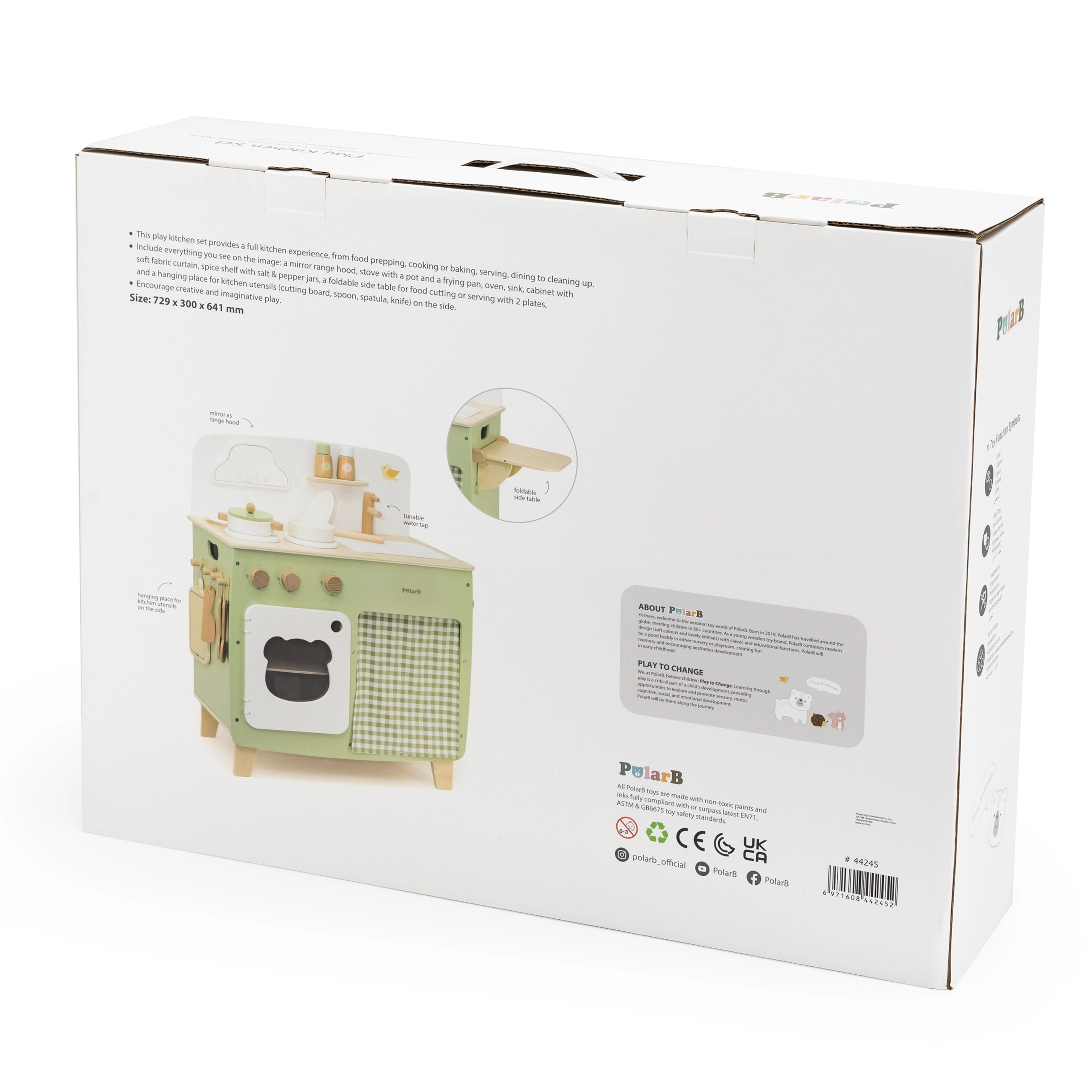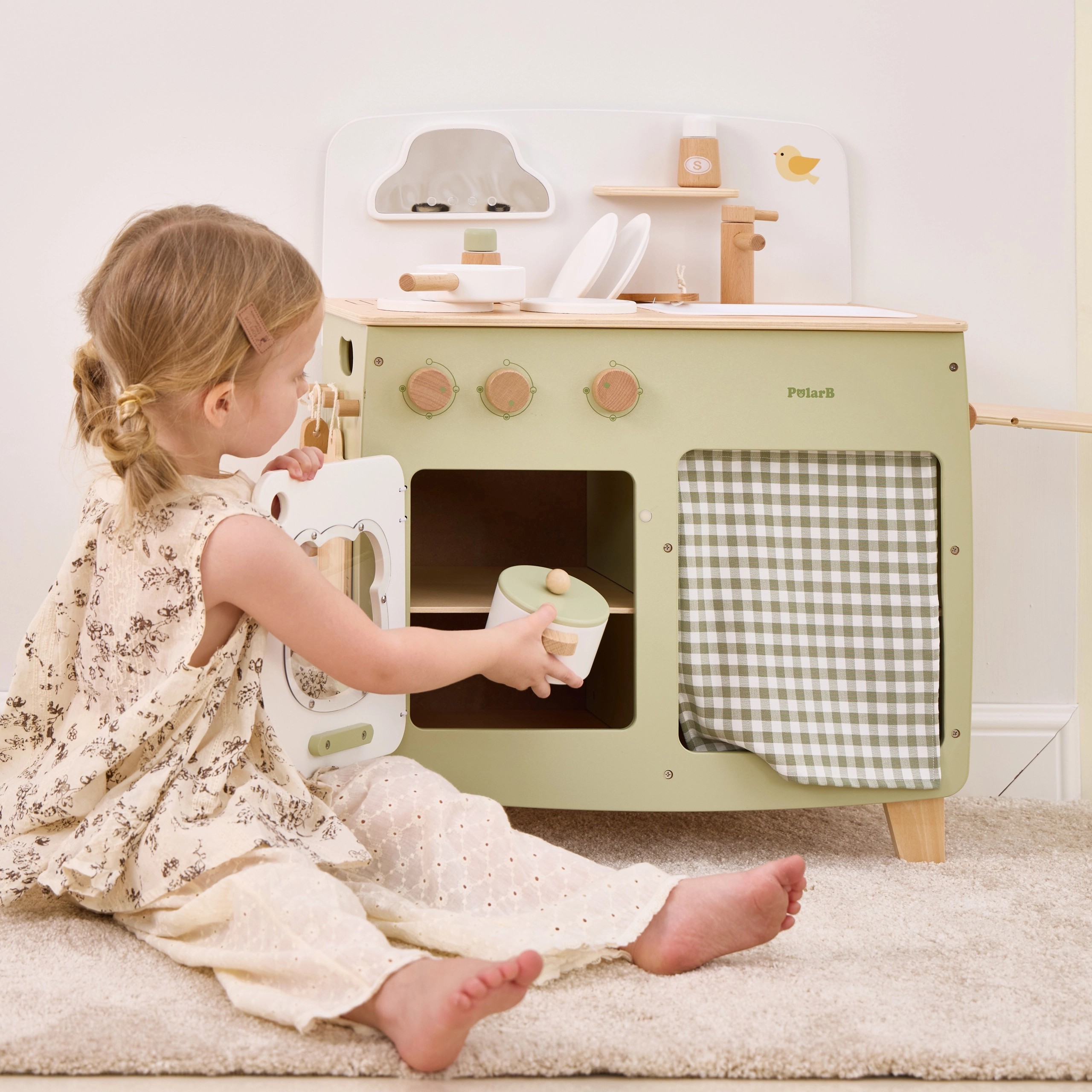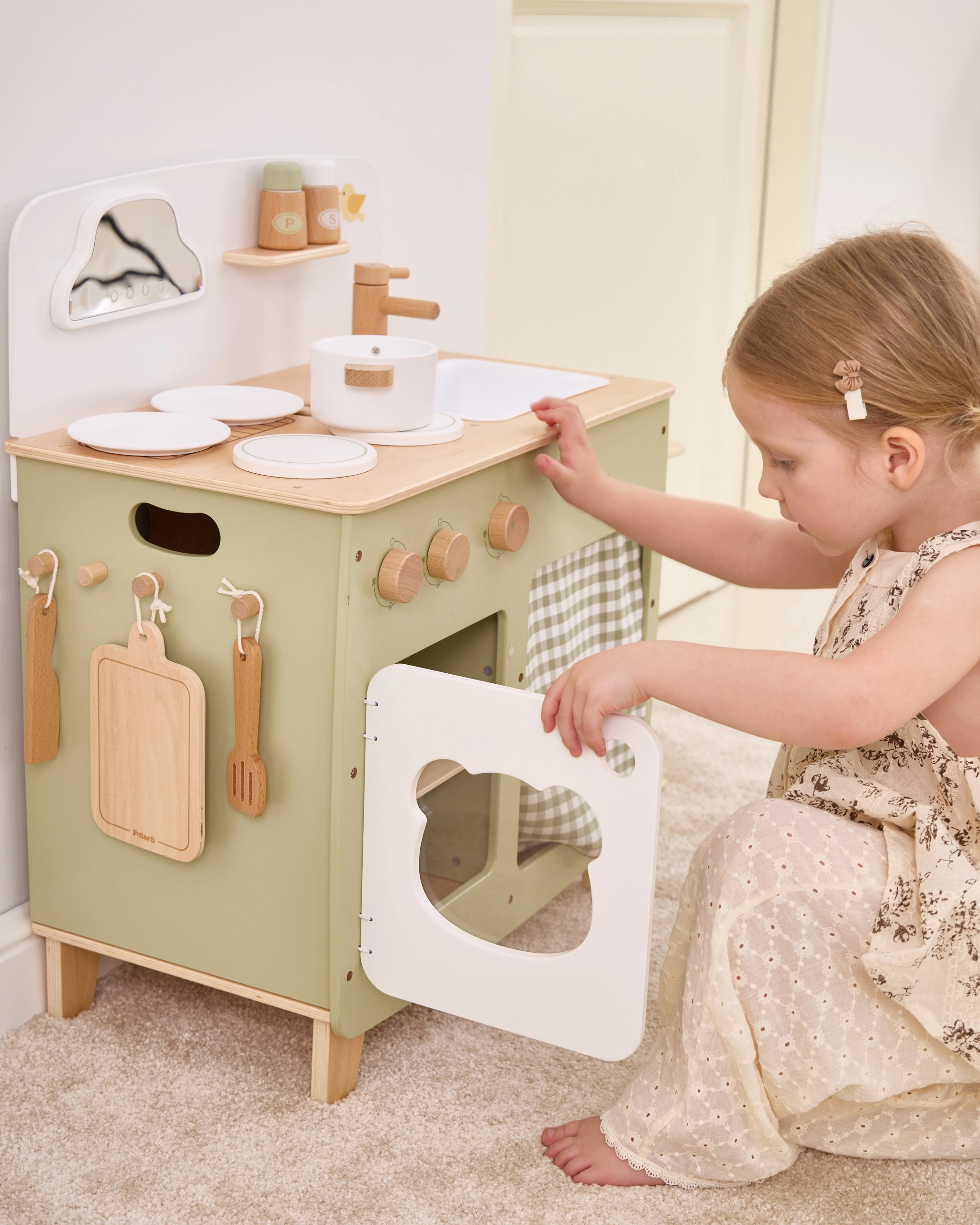 Stilinga vaikiška virtuvėlė jaukių natūralių ir žalių atspalvių suteiks vaikams realistišką gaminimo patirtį. Dėl tvirto medinio korpuso, pasukamų mygtukų, kriauklės ir orkaitės mažieji virėjai mėgausis valandomis saugaus ir kūrybiško žaidimo. Praktiškas nuleidžiamas šoninis pultas praplečia darbo zoną pjaustymui ar „valgymui“, o spintelė su užuolaidėle paslėps visus lobius.