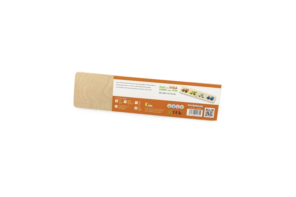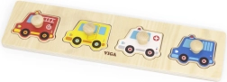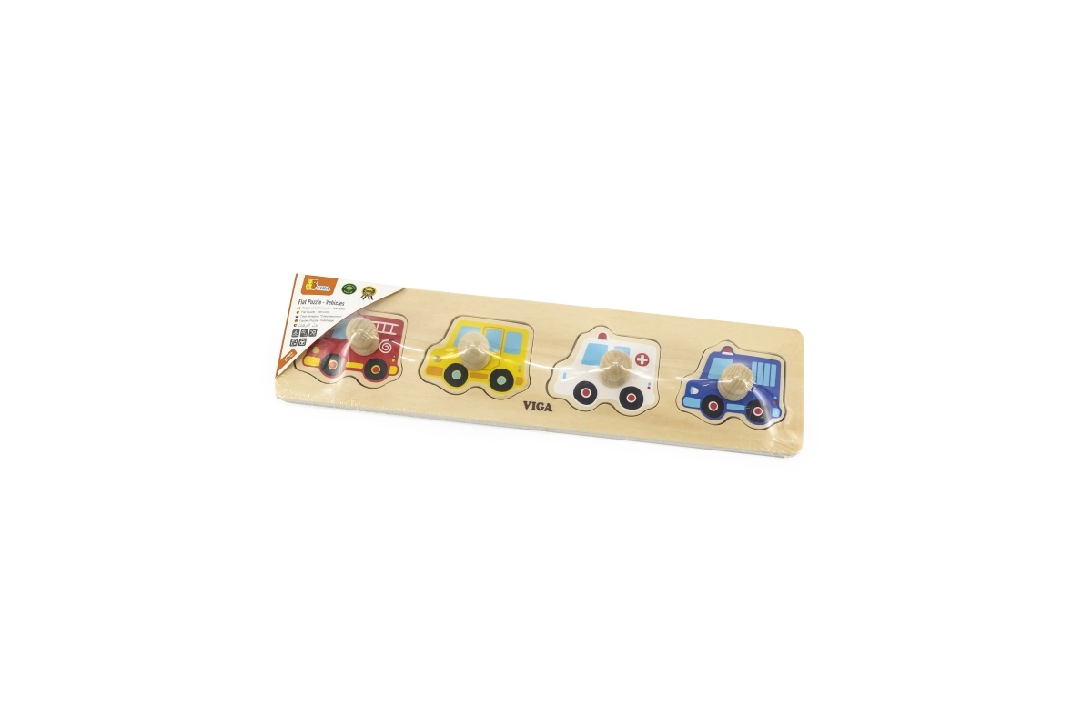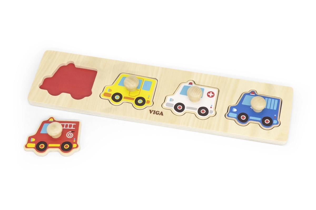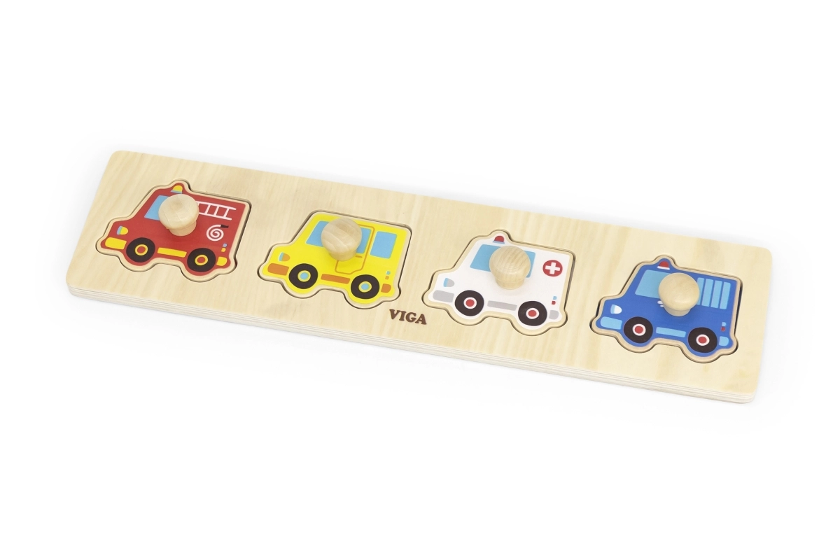 Ši kokybiška medinė dėlionė su keturiomis transporto priemonėmis (ugniagesių automobilis, taksi, greitosios pagalbos automobilis ir policijos automobilis) yra puikus pasirinkimas pirmai loginei veiklai. Dalys su praktiškomis sagos tipo rankenėlėmis palengvina suėmimą ir skatina vaikus vėl ir vėl dėlioti bei atrasti.