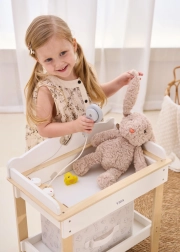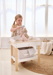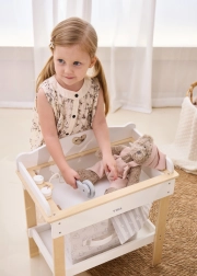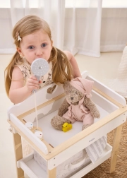 Patvari medinė konstrukcija užtikrina saugų ir stabilų žaidimą. Minimalistiniai natūralūs ir balti tonai lengvai įsilieja į modernų interjerą. Rinkinys puikiai tinka vaidmenų žaidimams, lavina smulkiąją motoriką, empatiją ir atsakomybę rūpinantis lėlėmis iki 43 cm.
