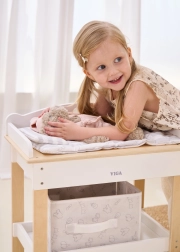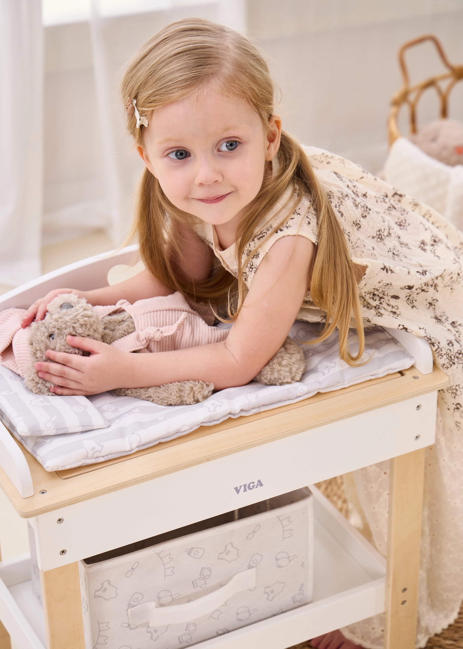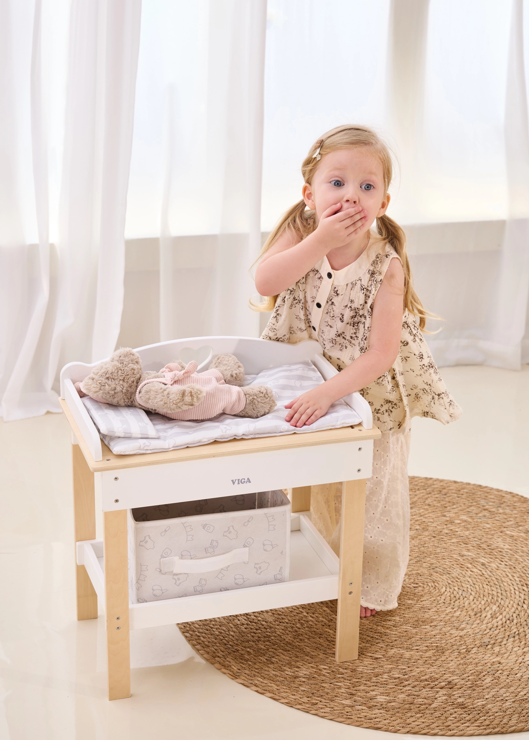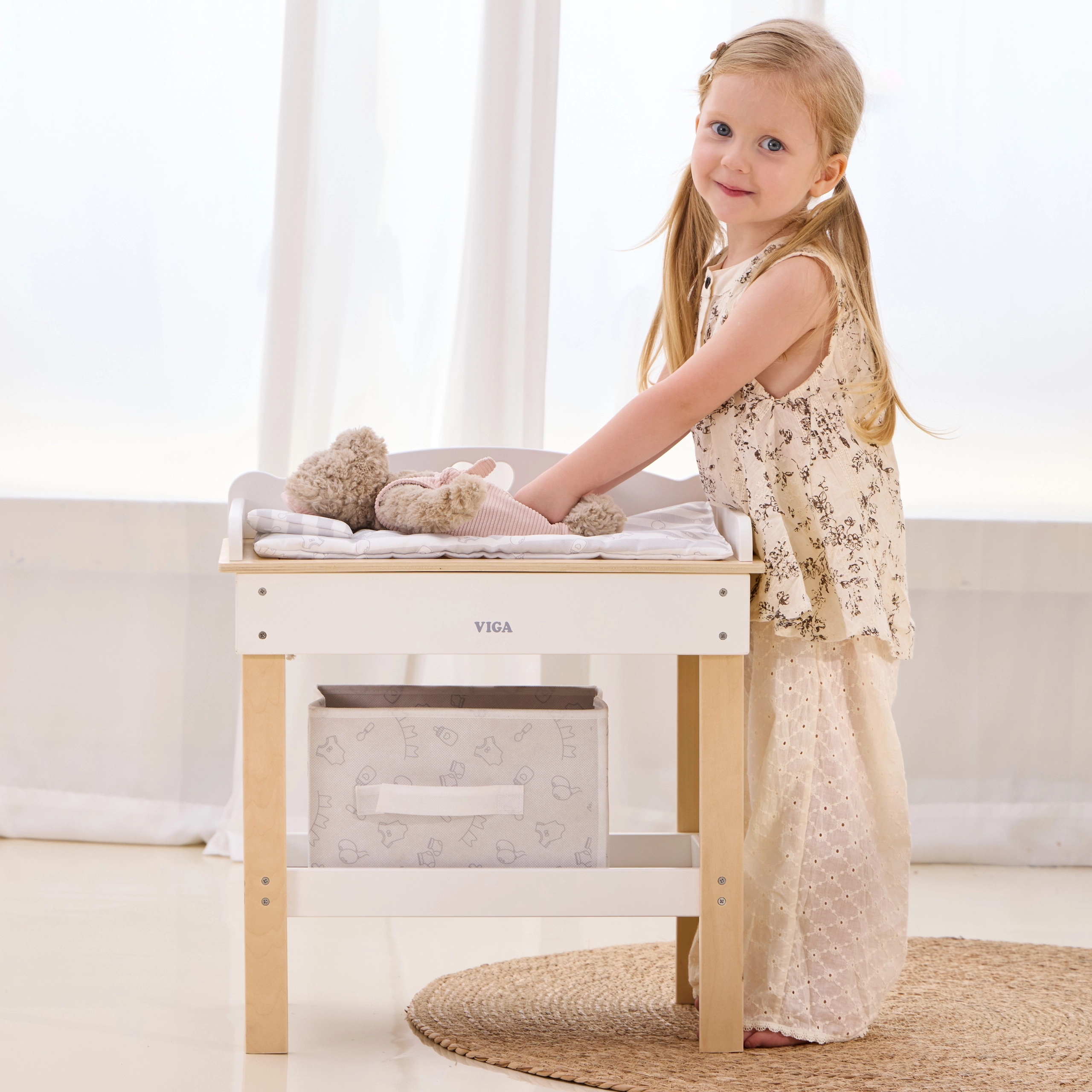 Vaikiškas medinis 2 viename VIGA vystymo stalas sujungia vystymo pultą ir lėlių vonelę viename stilingame balde. Jis pasižymi stabilia konstrukcija, patogiomis laikymo vietomis su tekstiline dėže ir švelniu dizainu, tinkančiu bet kuriam vaikų kambariui. Puikus žaislas vaizduotei lavinti ir lėlyčių priežiūros vaidmenų žaidimams.