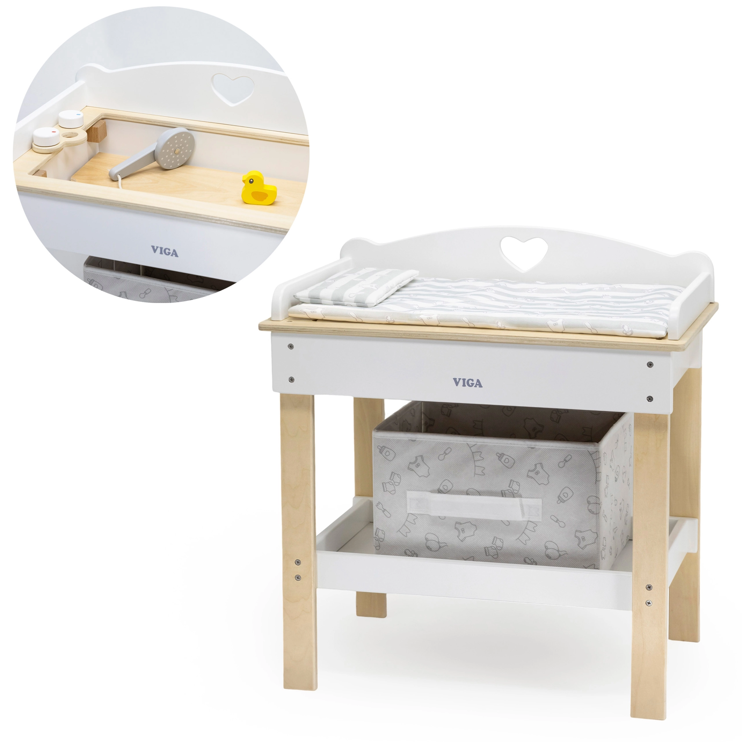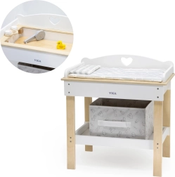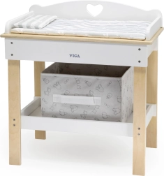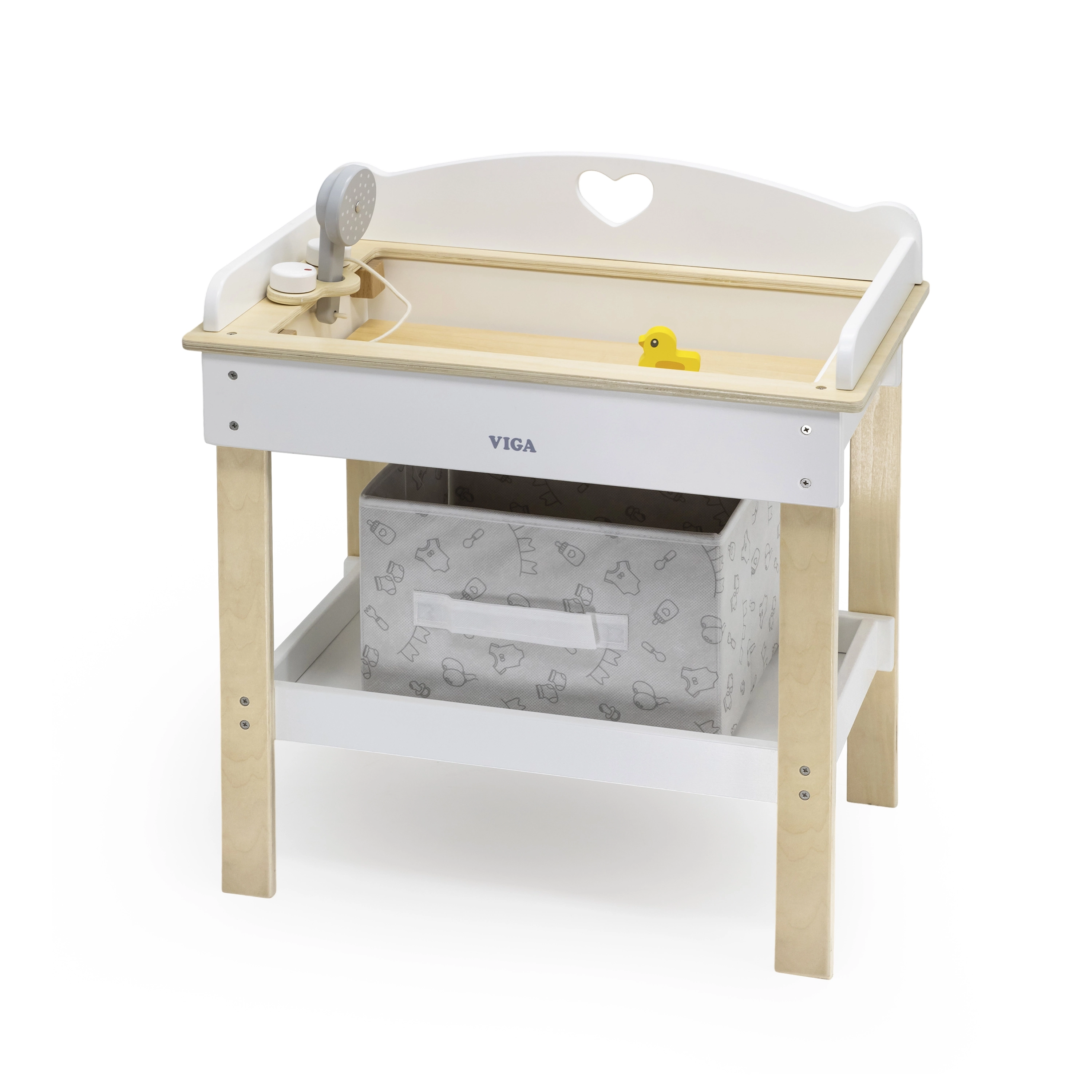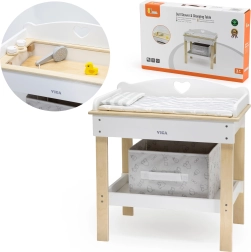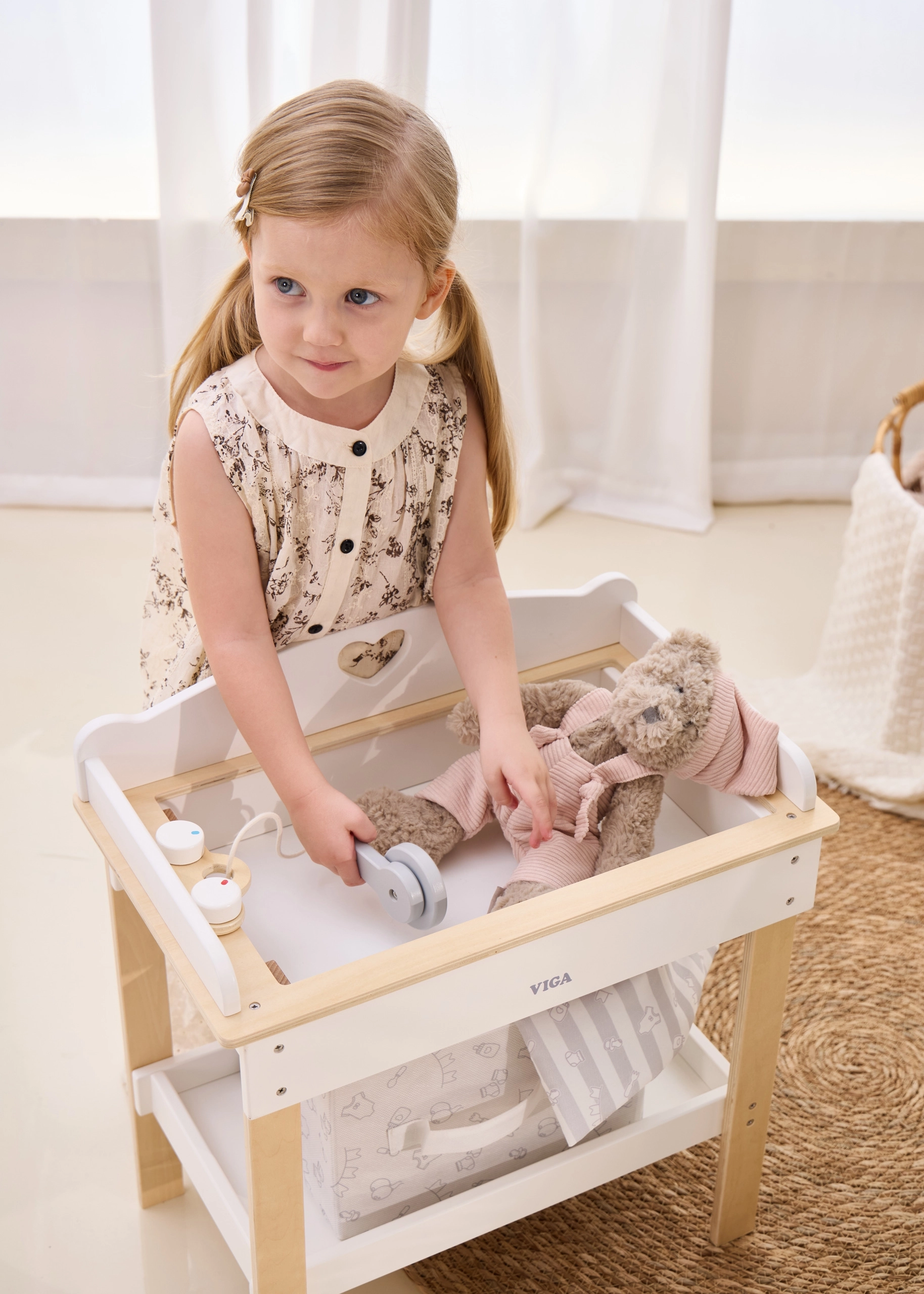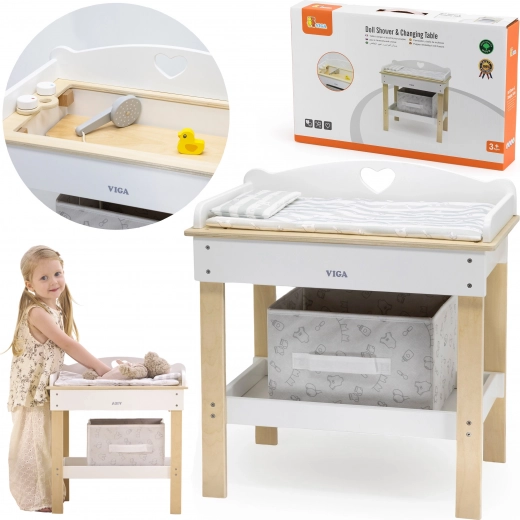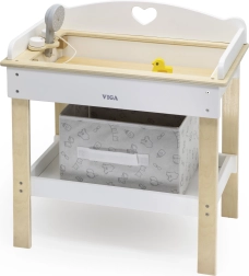 Šis daugiafunkcis VIGA rinkinys leidžia vaikams realistiškai žaisti rūpinantis kūdikiu. Viršutinė plokštė veikia kaip patogus vystymo pultas; nuėmus plokštę, jis virsta vonelė su dušo galvute lėlyčių maudymo ritualams. Apatinė lentyna su tekstiline dėže padeda visus aksesuarus laikyti tvarkingai po ranka.