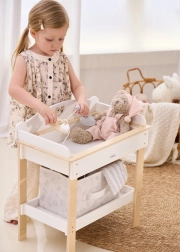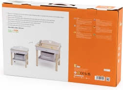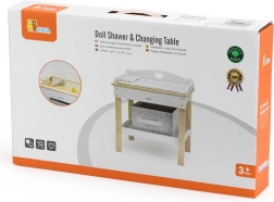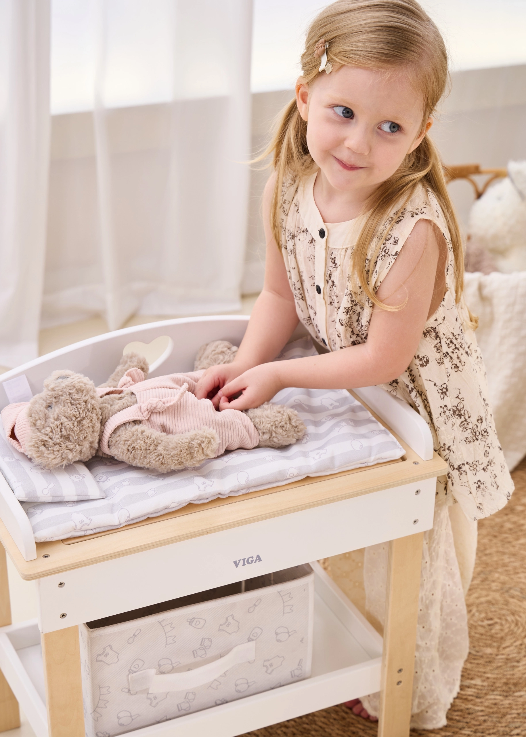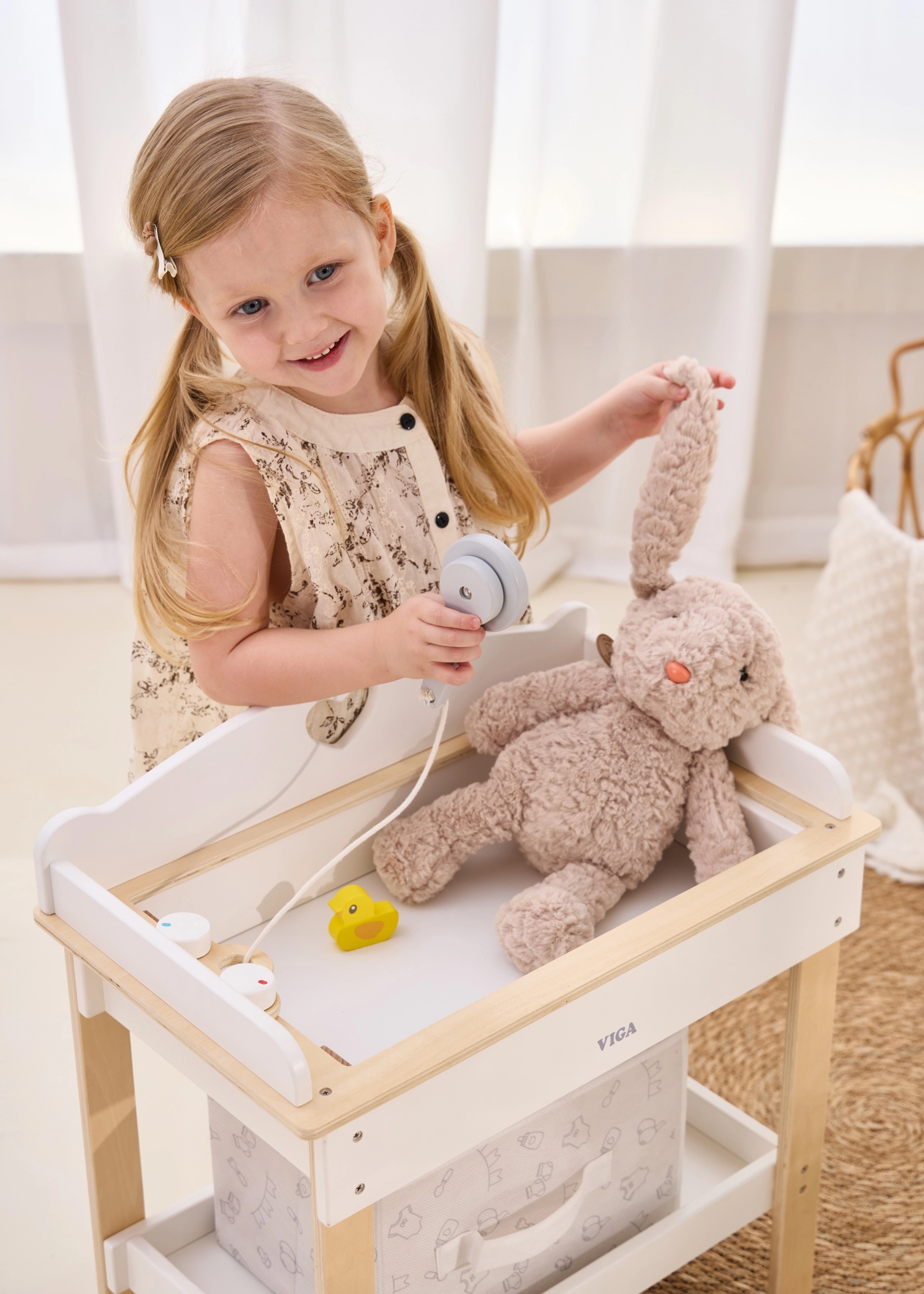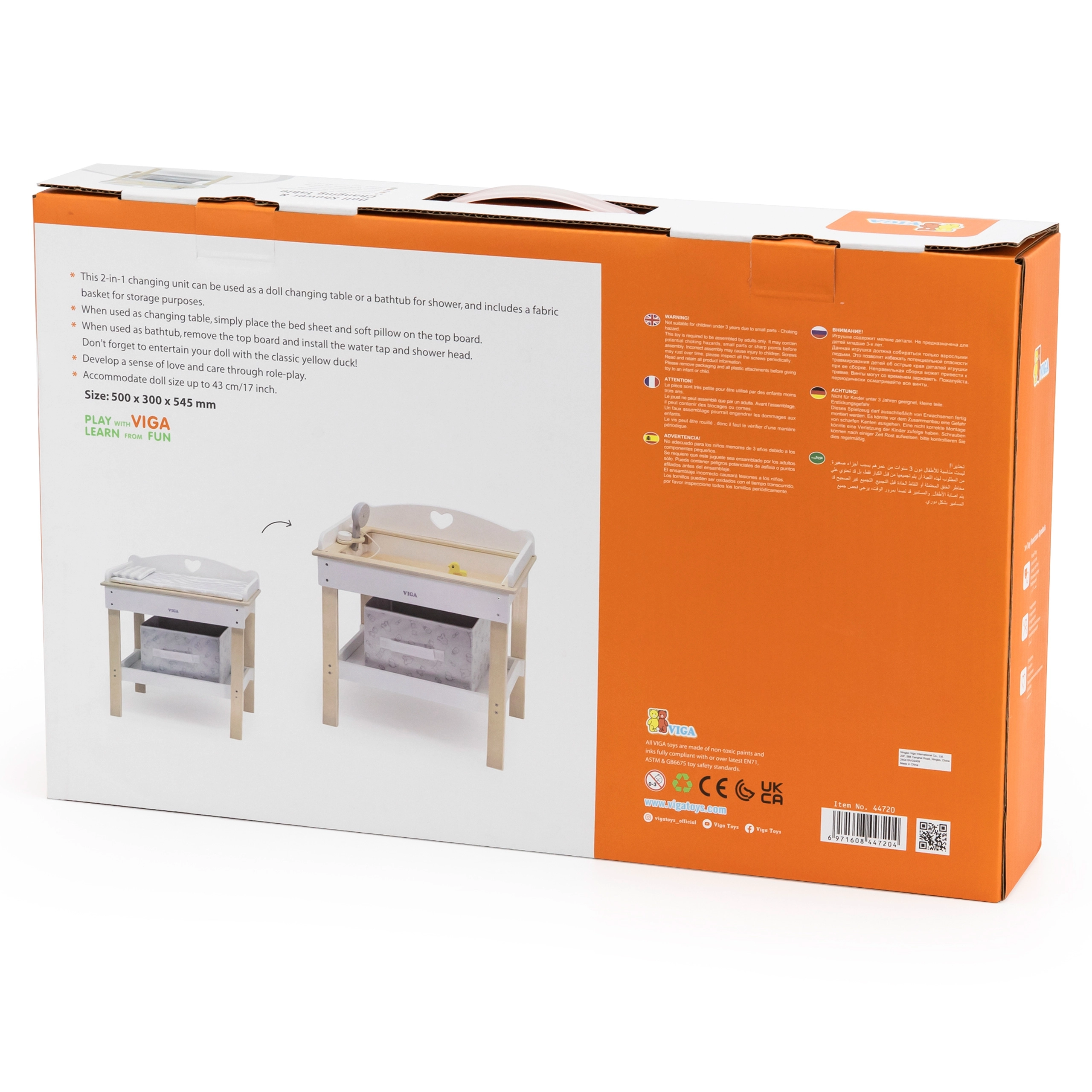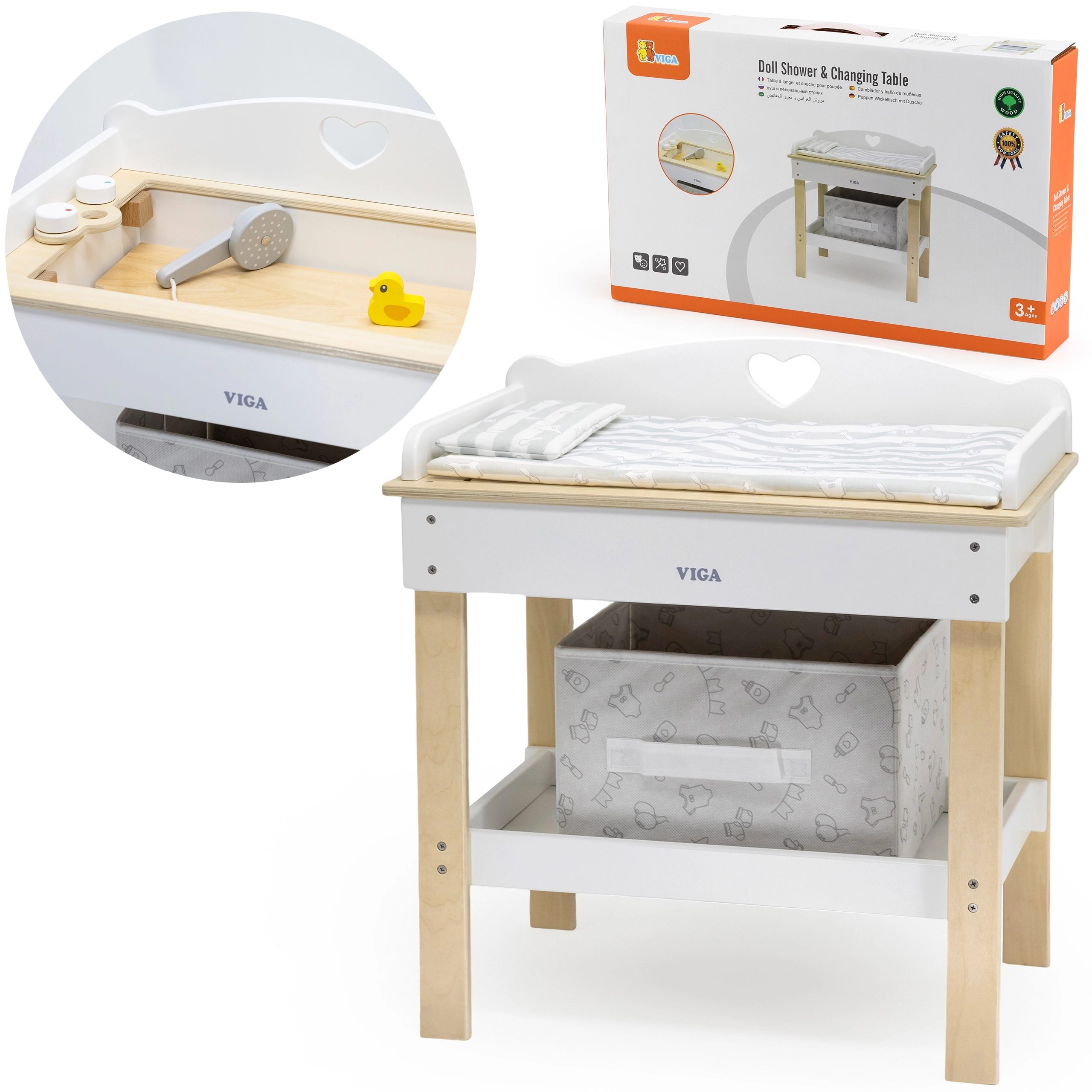 Šis daugiafunkcis VIGA rinkinys leidžia vaikams realistiškai žaisti rūpinantis kūdikiu. Viršutinė plokštė veikia kaip patogus vystymo pultas; nuėmus plokštę, jis virsta vonelė su dušo galvute lėlyčių maudymo ritualams. Apatinė lentyna su tekstiline dėže padeda visus aksesuarus laikyti tvarkingai po ranka.