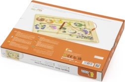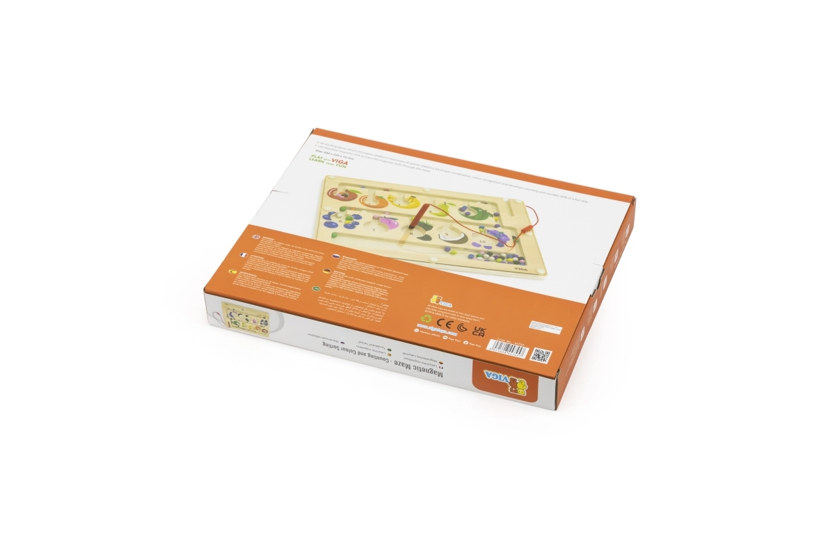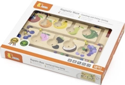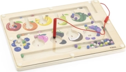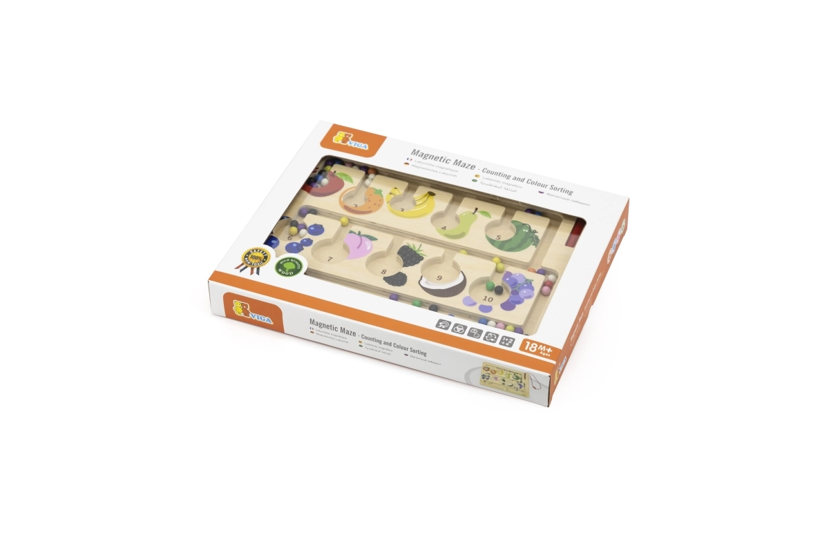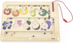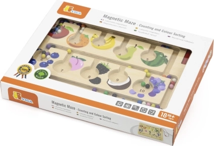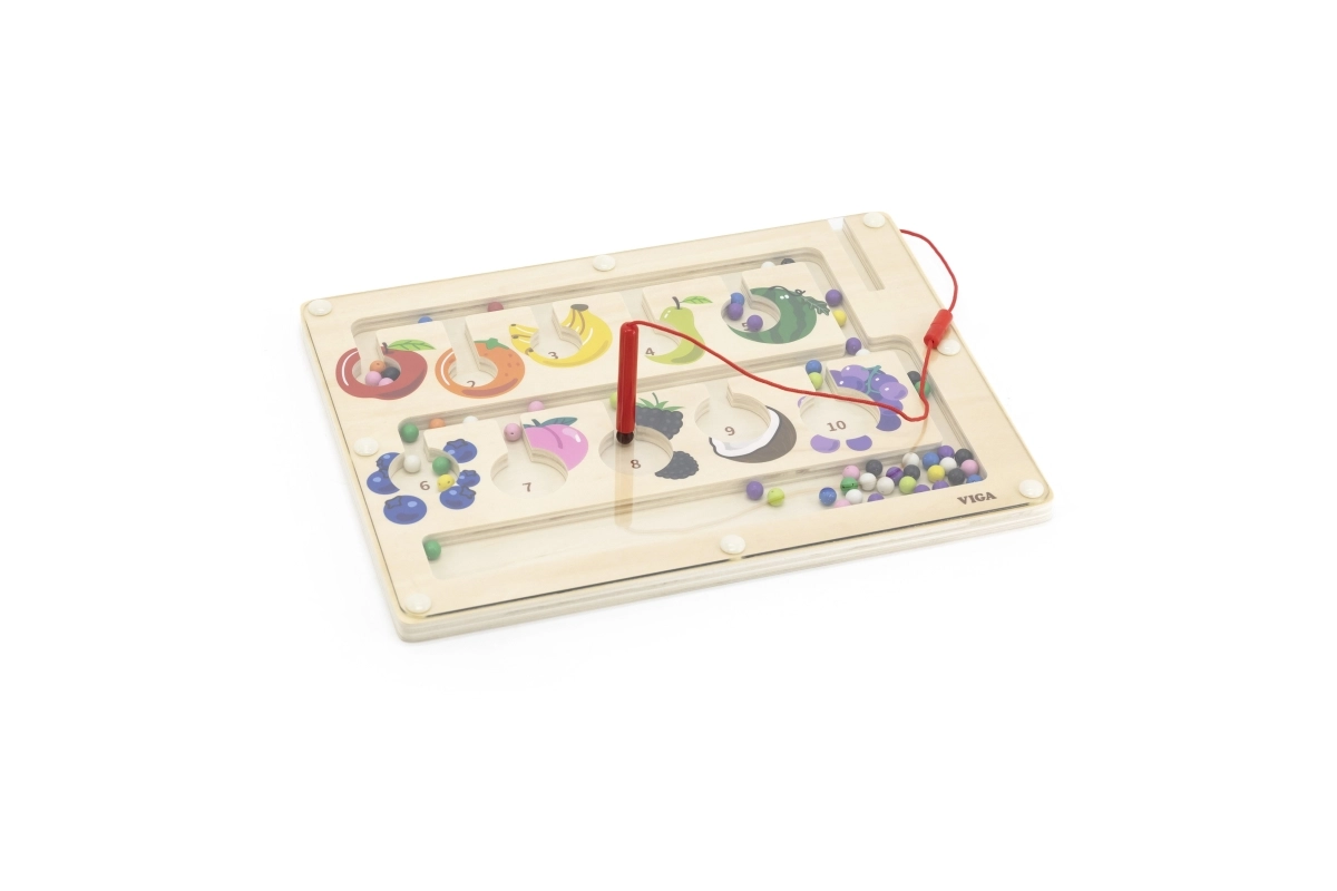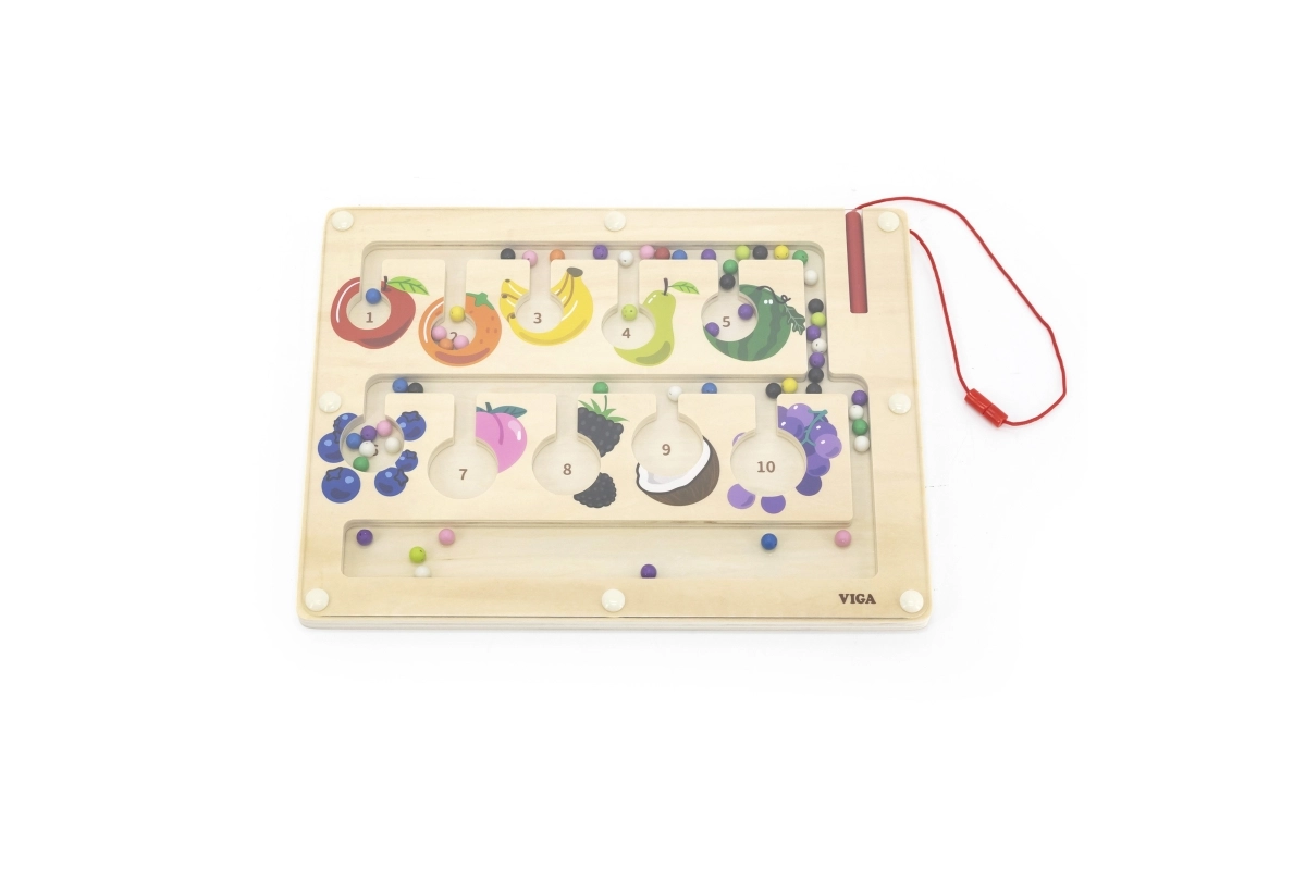 Šis kokybiškas medinis magnetinis labirintas – puikus edukacinis žaislas vaikų sumanumui lavinti. Vaikai su magnetiniu pieštuku stumdo spalvotus kamuoliukus pažymėtais takeliais, rūšiuoja juos pagal spalvas ir priskiria vaisių paveikslėliams ar skaičiams. Žaidimas skatina loginį mąstymą, susikaupimą ir akių–rankų koordinaciją.