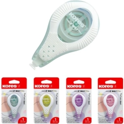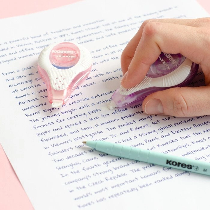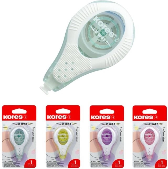 Vienkartinis korektorius Kores 2 Way Pastel užtikrina tikslias korekcijas dėl savo korekcinės juostelės, kurios plotis 4,2 mm, o ilgis 8 m.