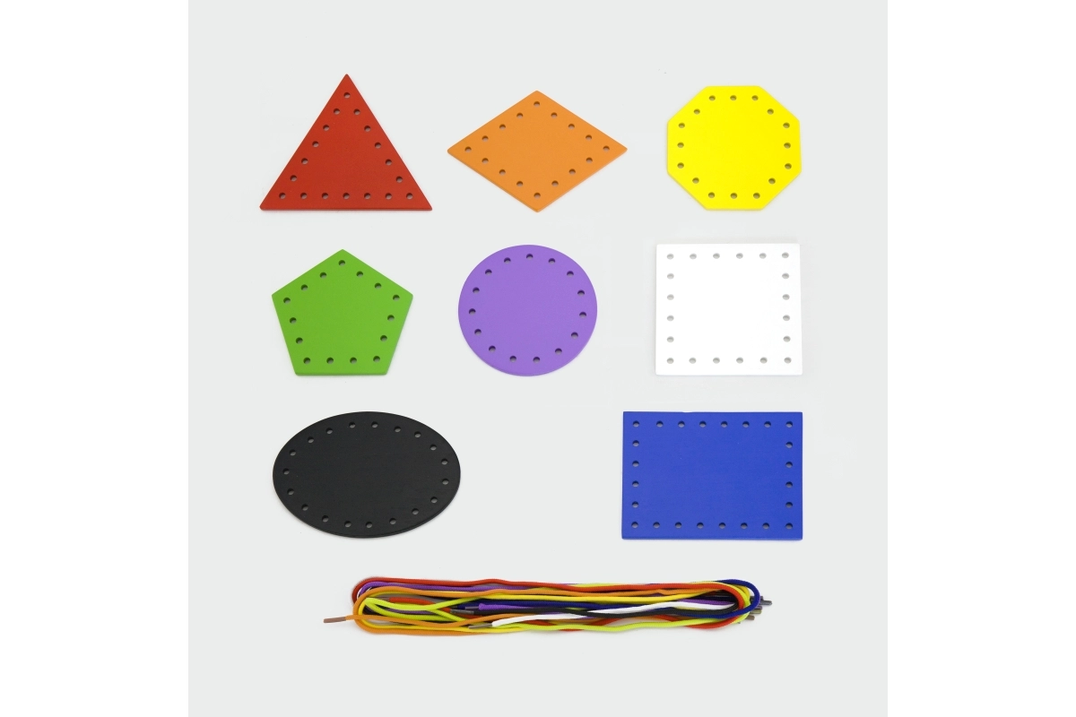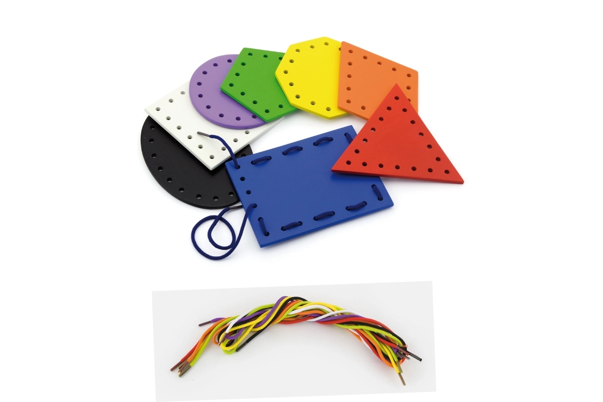 Aštuoni spalvoti formeliai ir aštuonios virvelės skatina rūšiuoti, derinti ir įvardyti. Vaikai smagiai mokosi spalvų ir geometrinių formų.