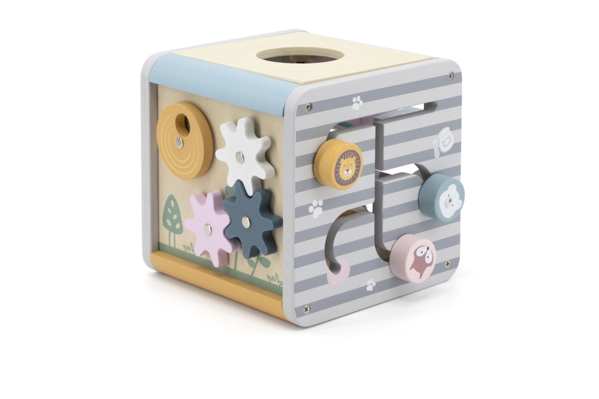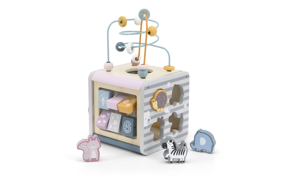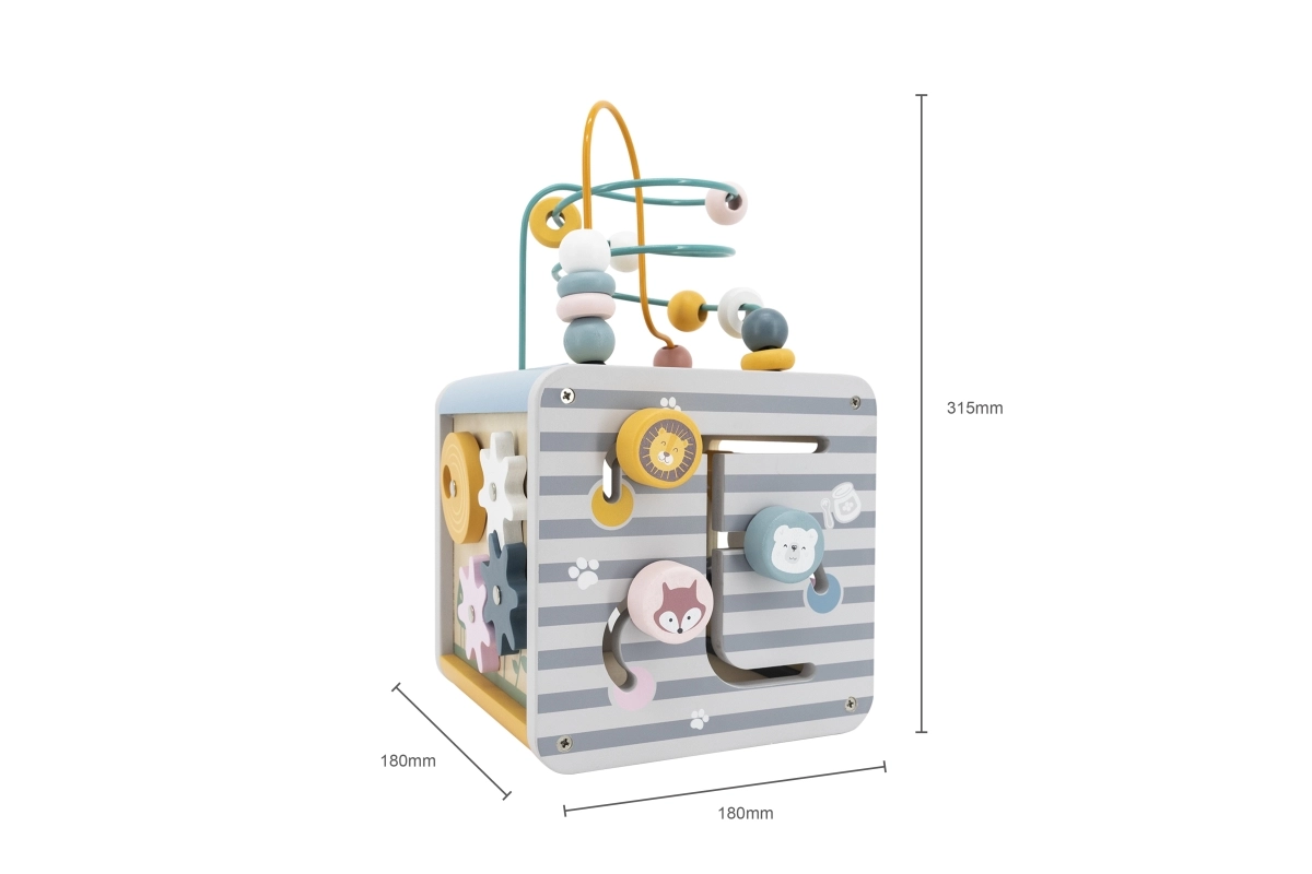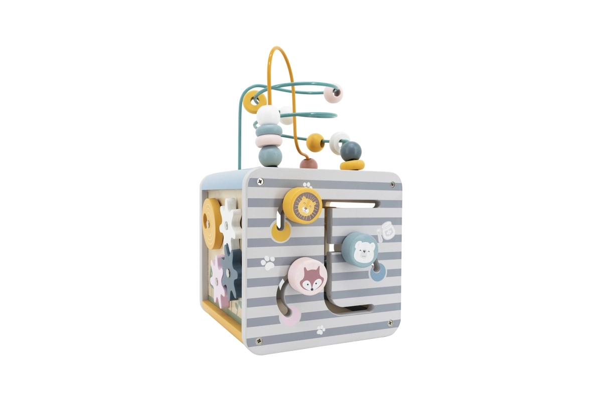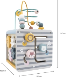 Viršutinėje dalyje rasite vielinį karoliukų labirintą smulkiajai motorikai ir kantrybei lavinti. Šoninėse sienelėse įrengti rūšiuoklis su gyvūnėliais, pasukamos kaladėlės su skaičiais pirmiesiems skaičiavimo žingsniams, krumpliaračiai priežasties ir pasekmės suvokimui bei stumdomi elementai koordinacijai treniruoti.