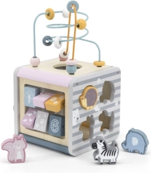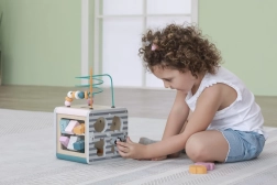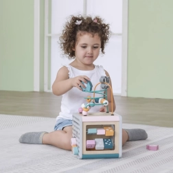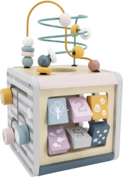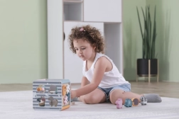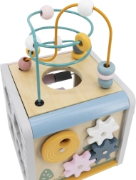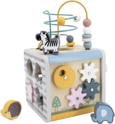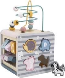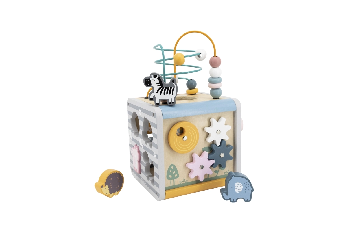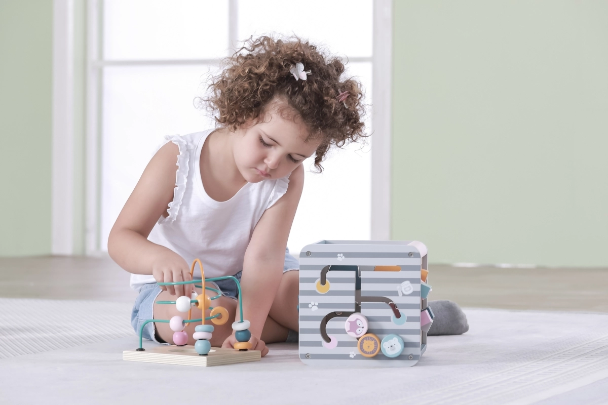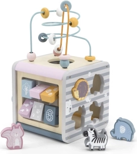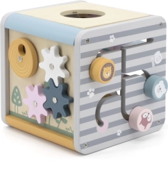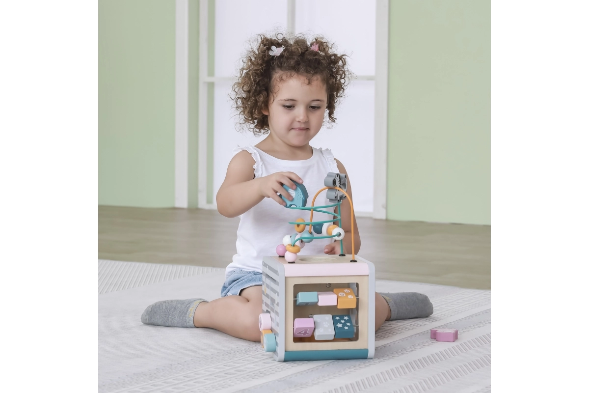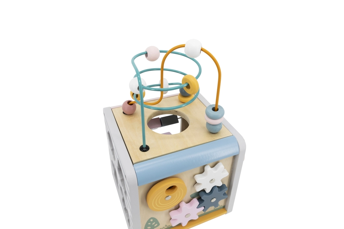 Viršutinėje dalyje rasite vielinį karoliukų labirintą smulkiajai motorikai ir kantrybei lavinti. Šoninėse sienelėse įrengti rūšiuoklis su gyvūnėliais, pasukamos kaladėlės su skaičiais pirmiesiems skaičiavimo žingsniams, krumpliaračiai priežasties ir pasekmės suvokimui bei stumdomi elementai koordinacijai treniruoti.