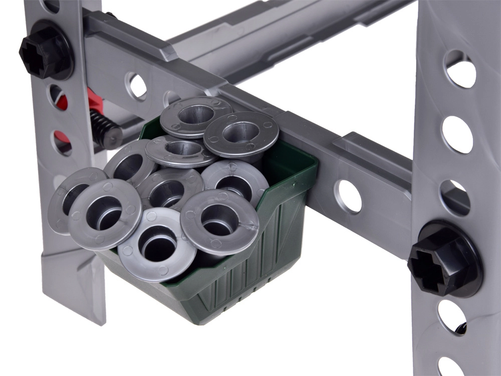 - Gausi komplektacija: darbo stalas, varžtai ir veržlės, akumuliatorinis grąžtas, plaktukas, rankinis pjūklas, liniuotė, reguliuojamas raktas, replės, atsuktuvas, metras, slankmatis, skylėtos lentelės, spaustuvai ir dėtuvės.