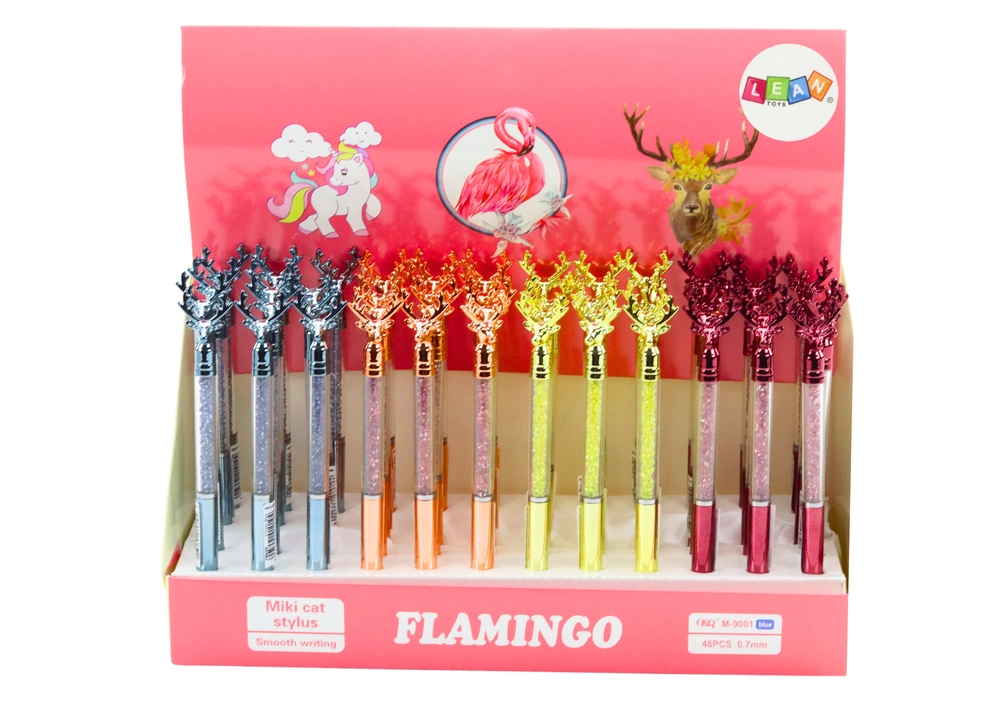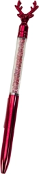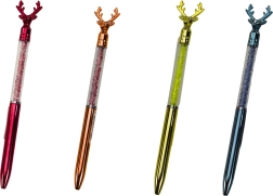 Elegantiškas rutulinis rašiklis su smulkia elnio figūrėle ir permatomu korpusu, užpildytu žvilgančiais akmenėliais, suteiks rašymui prabangos įspūdį. Siūlo mėlyną arba juodą rašalą, ploną 0,7 mm galiuką ir patogų rašymą kasdieniam naudojimui ir ypatingoms progoms.