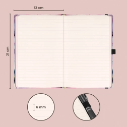 Elegantiška linijuota užrašų knygutė NOTIQUE Sakura patogiame 13 × 21 cm formate su kietais viršeliais, užsegimu su gumyte, rašiklio kilpele ir vidine kišene. Siūlo 172 puslapius malonaus geltono popieriaus dienoraščiui ir darbo užrašams.