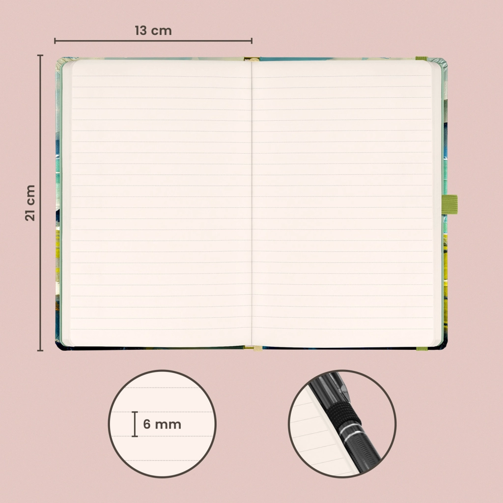 13 × 21 cm dydis puikiai telpa į rankinę ar kuprinę – nesvarbu, ar planuojate, rašote dienoraštį, ar fiksuojate darbo užduotis. Vidinė kišenė talpina smulkmenas, vizitines korteles ar laisvus lapelius, kad viską turėtumėte tvarkingai vienoje vietoje.