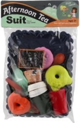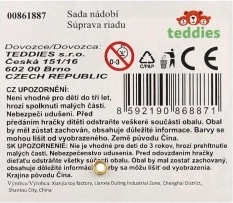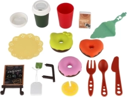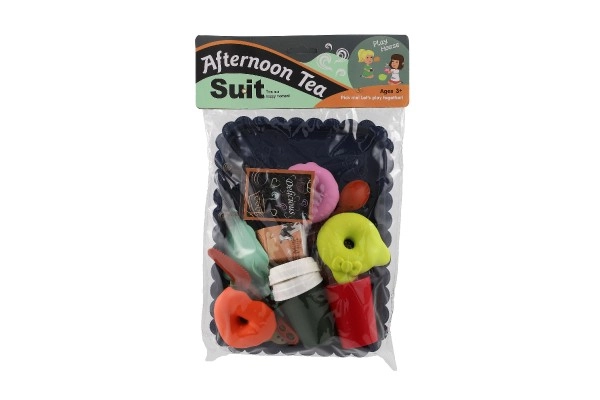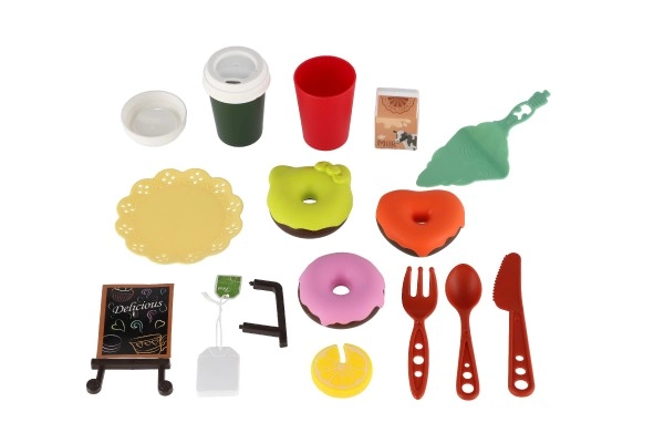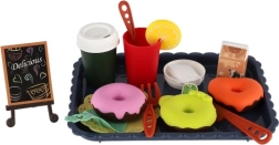 Komplekte yra dekoratyvinis mėlynas padėklas, kavos puodelis, mažas arbatinukas, buteliukas/puodelis, pieno indelis, stalo įrankiai ir įvairūs saldūs skanumynai. Rinkinys puikiai lavina socialinius įgūdžius, komunikaciją ir fantaziją žaidžiant su draugais.