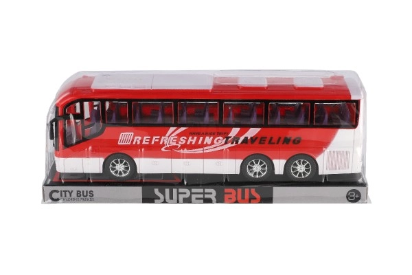 Pristatome autobusą, apie kurį svajoja kiekvienas mažas vairuotojas! Šis tolimųjų reisų autobuso modelis su frikcine pavara išsiskiria autentiškomis detalėmis ir kokybiška apdaila. Puikiai tinka mažiesiems vairuotojams, norintiems patirti didelio autobuso vairavimo jaudulį.