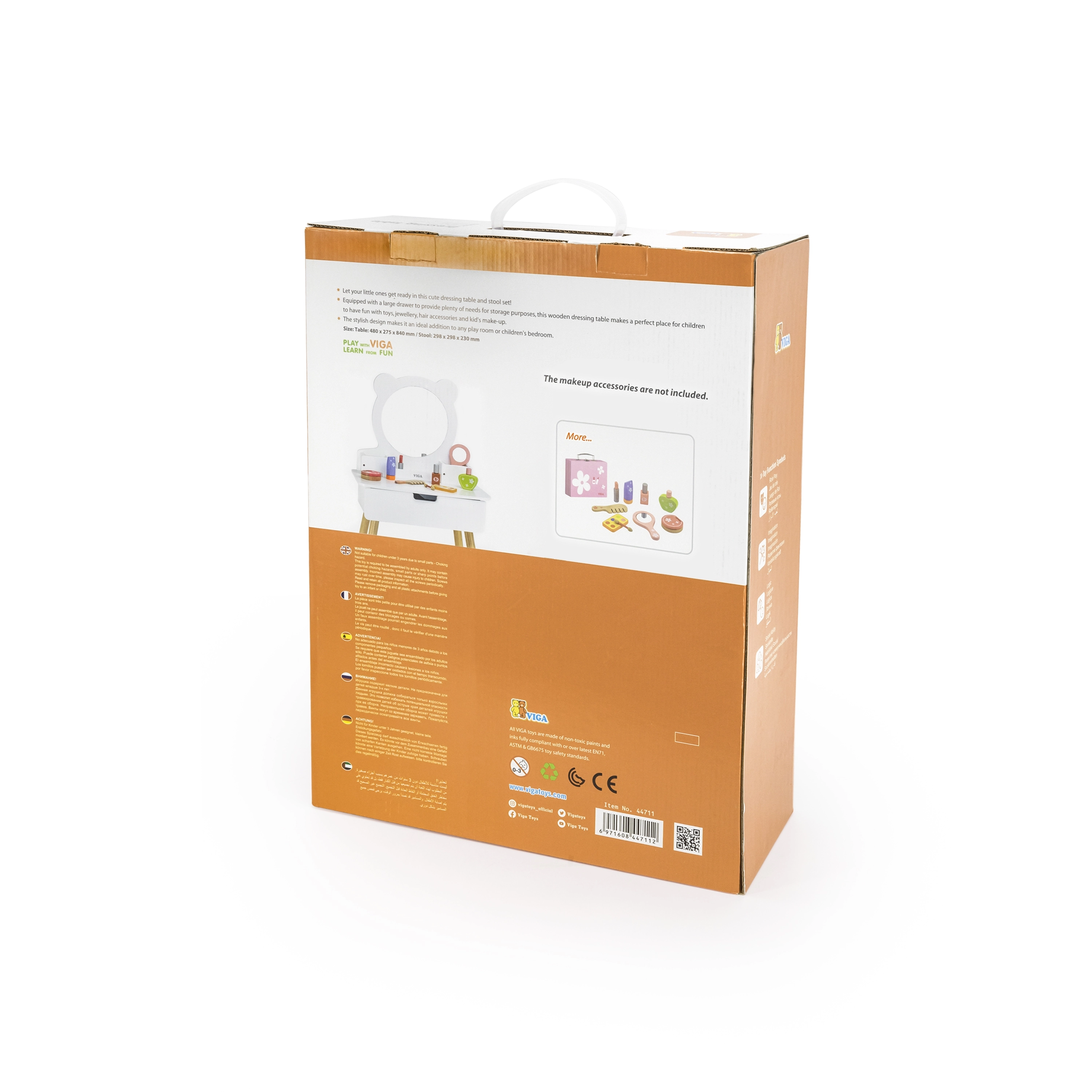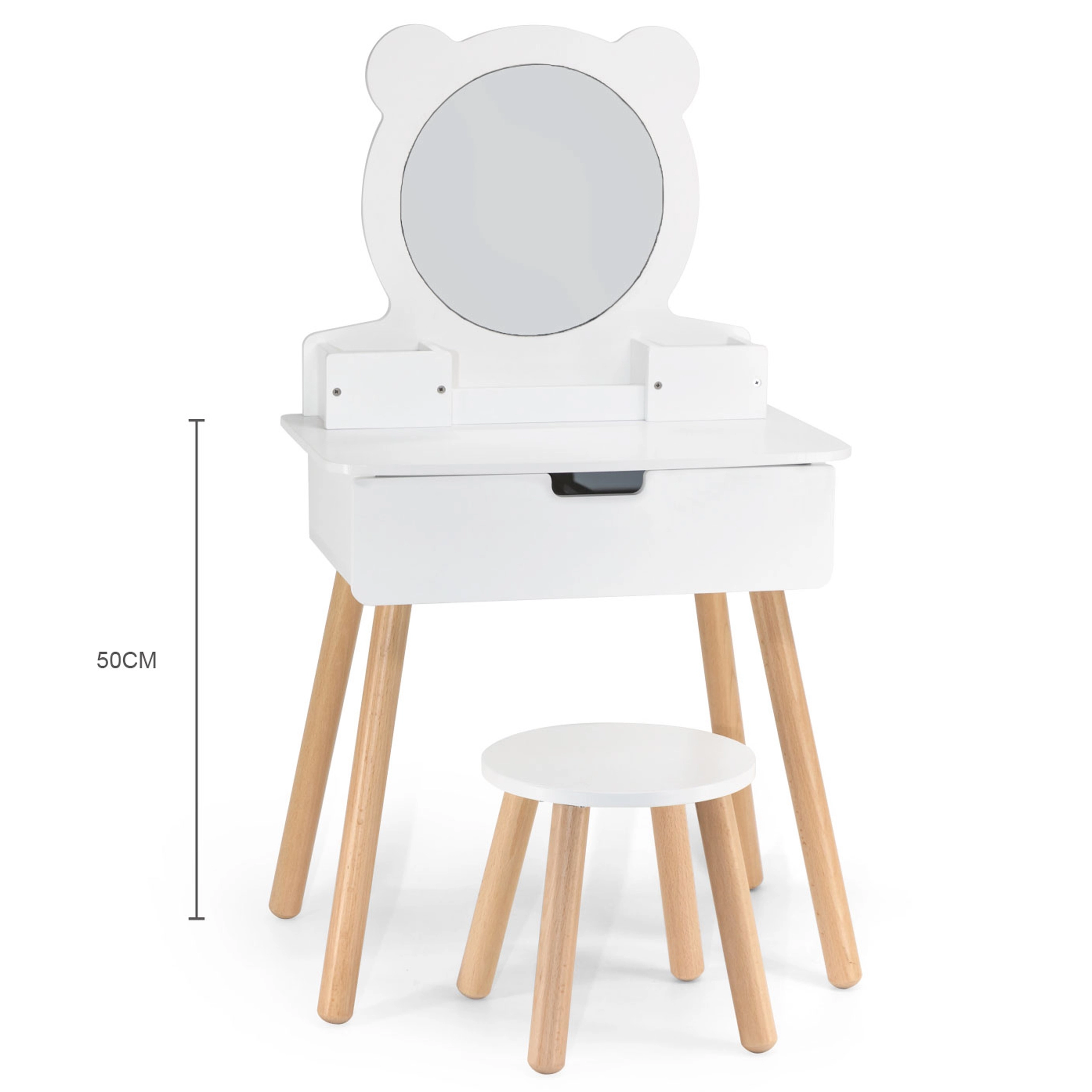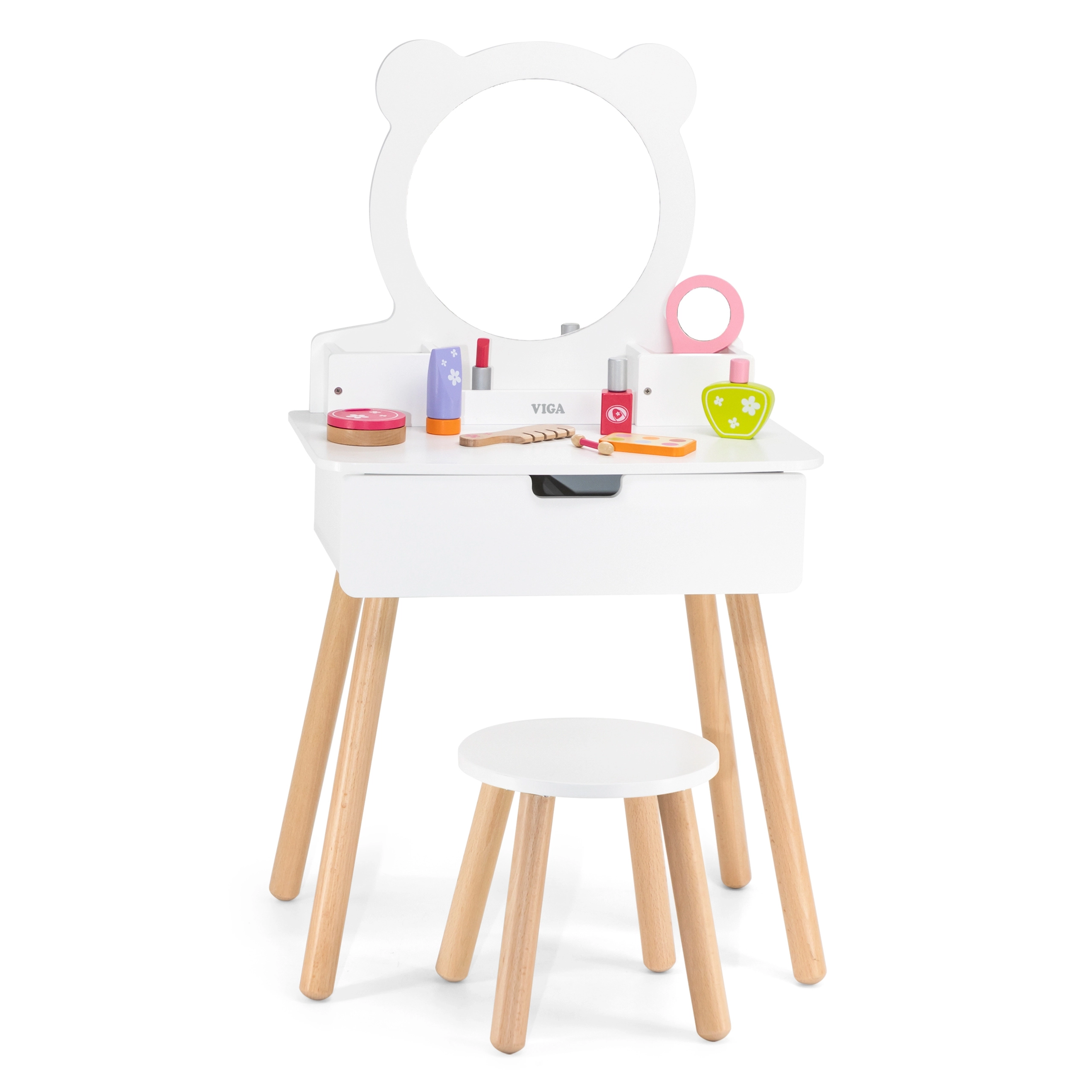 VIGA kosmetinis staliukas su meškiuko veidrodžiu turi praktiškas laikymo vietas, kurios paskatins vaikus kūrybiškai žaisti. Staliukas su medinėmis kojelėmis, elegantiškos baltos spalvos, sužavės kiekvieną mažąją damą.
